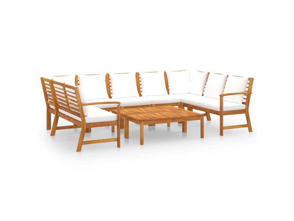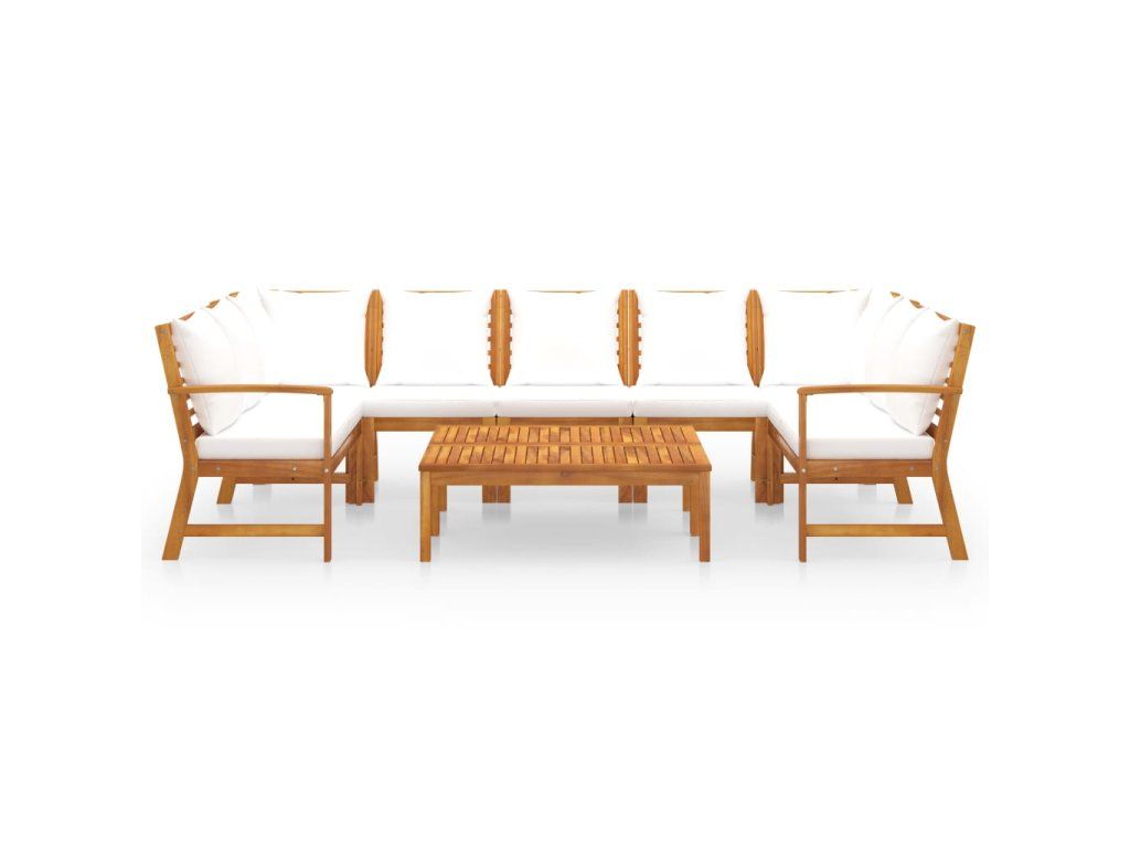 Sedací souprava s masivním akáciovým rámem je pevná, robustní a odolná. Akáciové dřevo je napuštěné olejem, nábytek je tudíž vhodný pro venkovní použití. Součástí soupravy je také konferenční stolek s unikátním lamelovým designem. Můžete si na něj odkládat občerstvení, nápoje, šálky s čajem, knihy apod. a mít vše potřebné na dosah ruky. Sadu dodáváme s vysoce pohodlnými, hustě polstrovanými poduškami na sedák a opěradlo. Polyesterové potahy na podušky se snadno udržují, je možné je sejmout a vyprat. Set má modulární design, takže všechny díly je možné přestavět a upravit podle vašich potřeb.