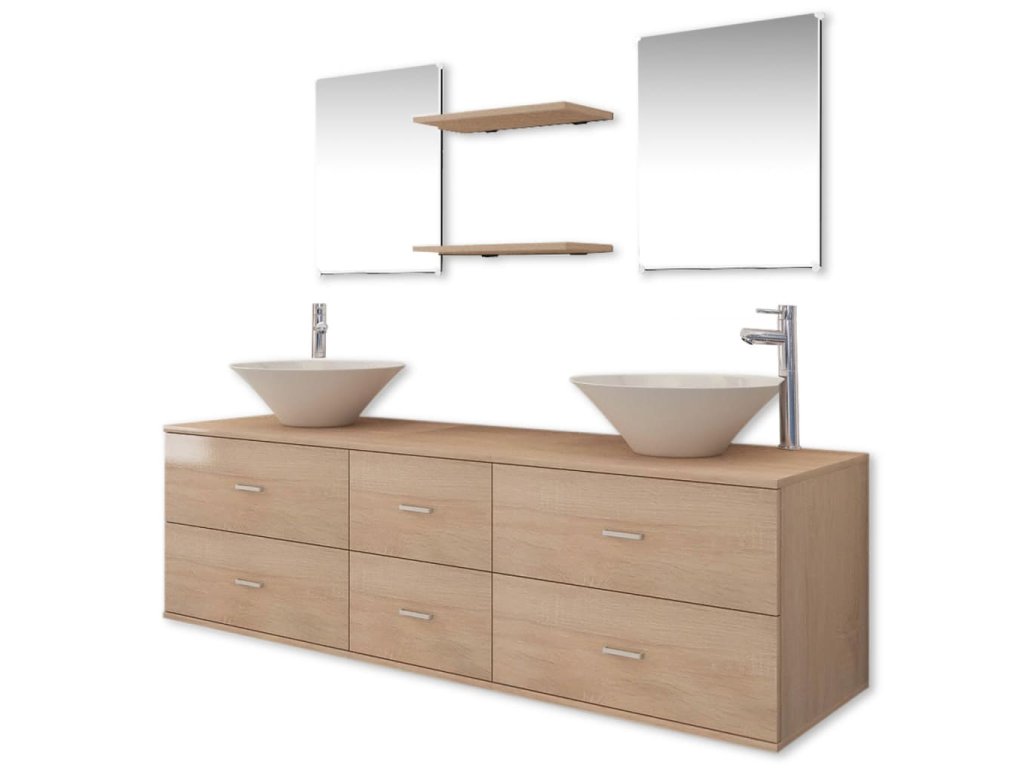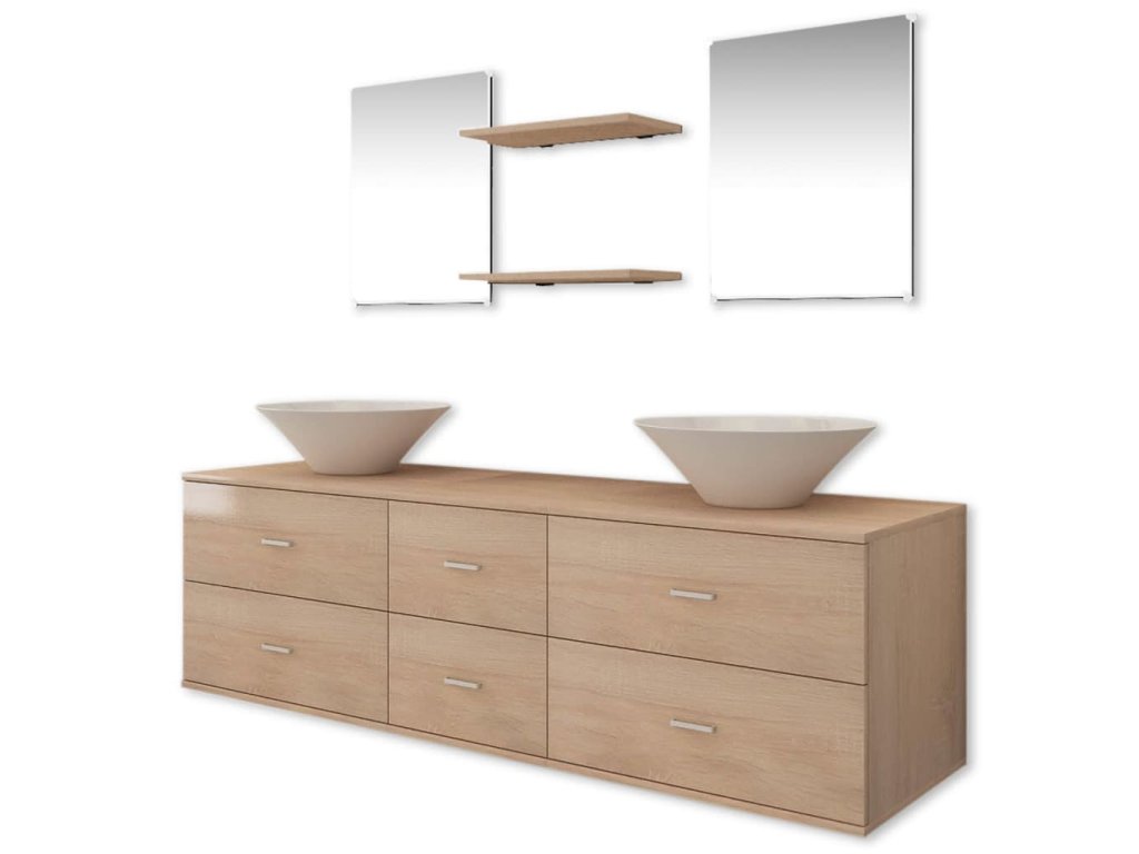 Tento kompletní set se skládá z 1 nástěnné skříňky pod umyvadlo, 2 zrcadel, 2 polic, 2 umyvadel a 2 vodovodních baterií a bude skvělým doplňkem do vaší koupelny. Optimalizuje její prostor, aniž byste museli slevit ze svého stylu.