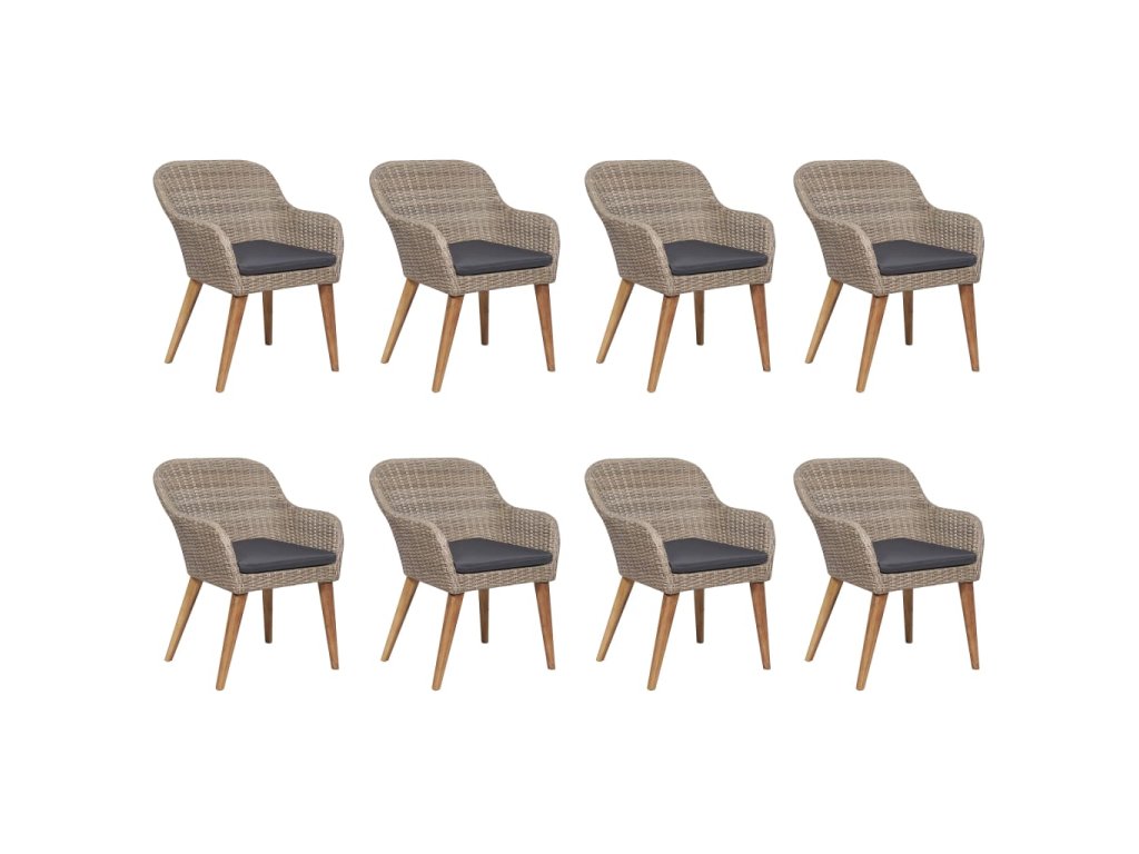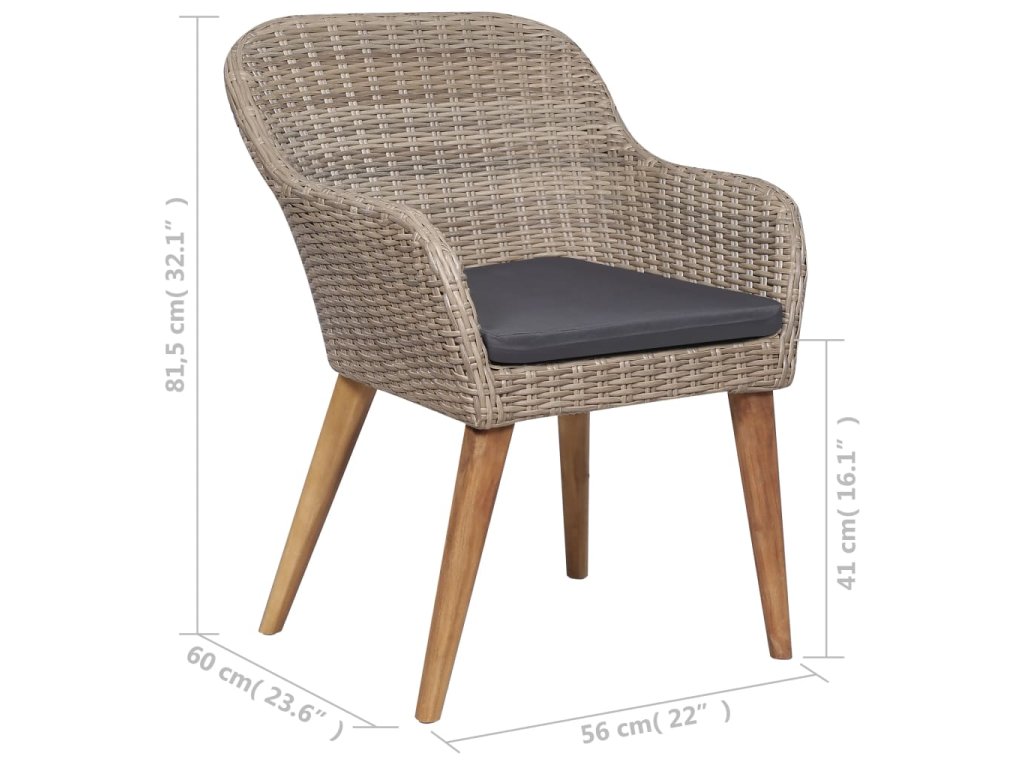 Jídelní stůl je zhotovený z masivního akáciového dřeva s olejovaným povrchem, takže je stabilní, odolný a nenáročný na údržbu. Jídelní židle mají rám z práškově lakované oceli, opletený PE ratanem, který výborně vzdoruje klimatickým vlivům. Dlouho vám proto vydrží a snadno je očistíte. Ergonomický tvar spolu s hustě polstrovanými poduškami vám při sezení zaručí maximální pohodlí. Polyesterové potahy podušek nevyžadují téměř žádnou údržbu a dají se jednoduše stáhnout a oprat.