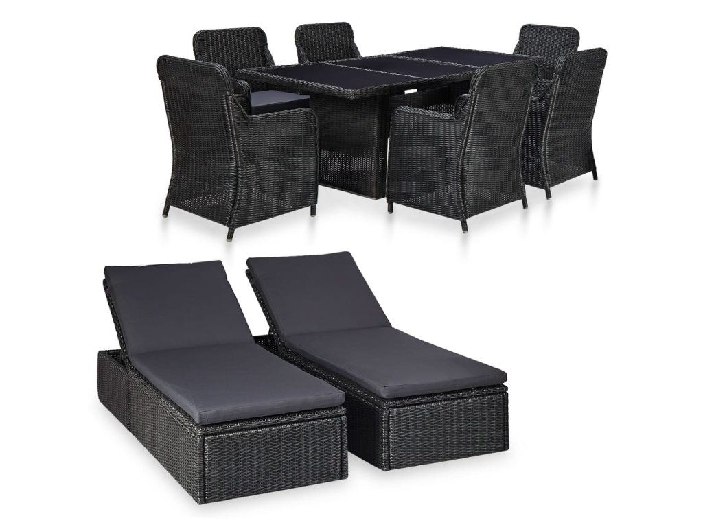 Stůl i židle mají kovový rám s práškovým nástřikem, jsou tedy pevné a odolné. Zároveň jsou ovšem také lehké, takže se dají snadno přesouvat. Dvě opalovací lehátka vám přijdou vhod, až si budete chtít užívat volného času na zahradě nebo u bazénu. Jelikož jsou všechny části jídelní sestavy z polyratanu, který je odolný vůči vodě i povětrnostním vlivům, velice jednoduše se čistí. Silně polstrované měkké podušky a polštáře za záda vám poskytnou mimořádné pohodlí. Jejich potahy navíc disponují skrytými zipy, tudíž je lze bez námahy sejmout a vyprat, což vám výrazně usnadní údržbu.