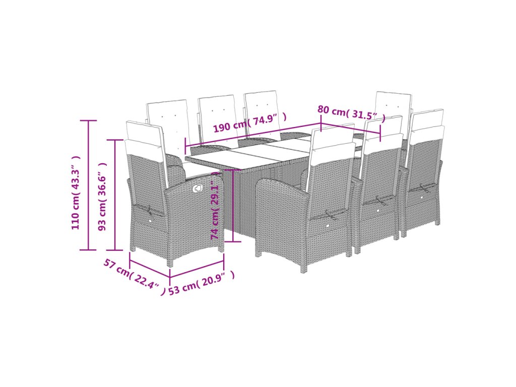 - Rozměry: 190 x 80 x 74 cm (Š x H x V)