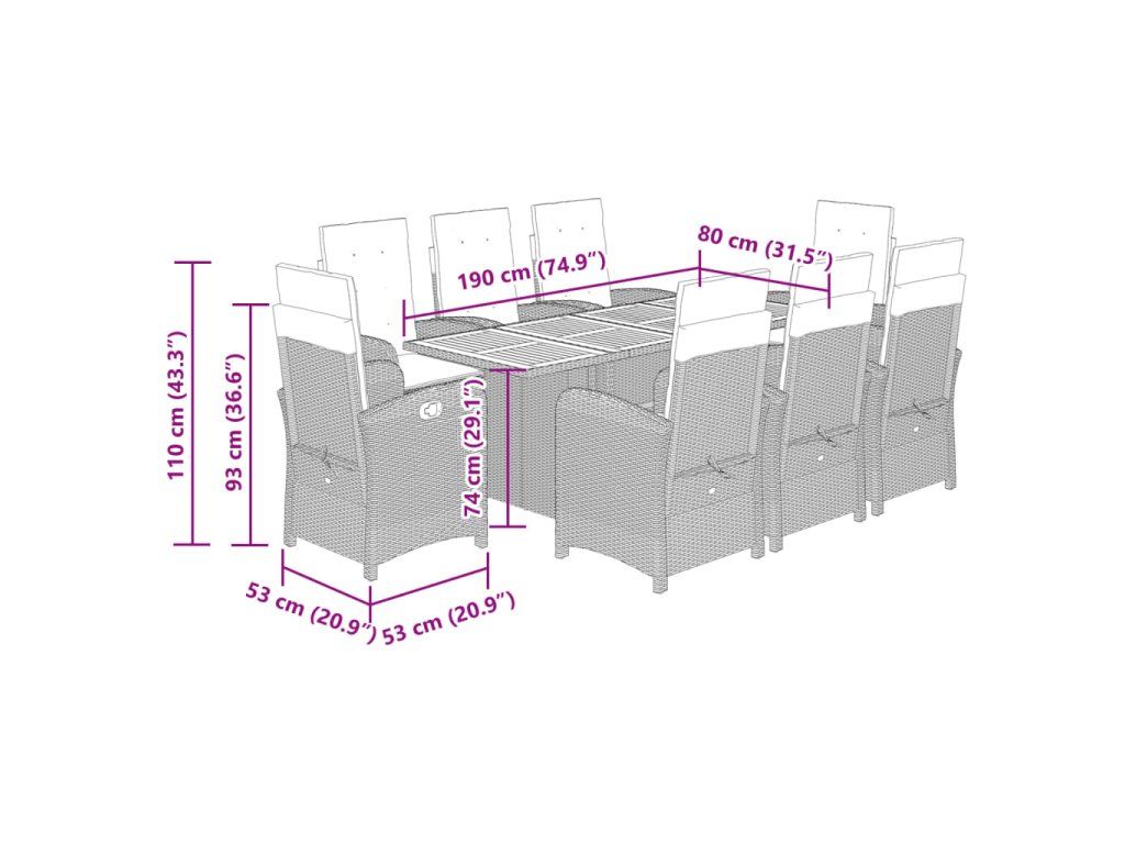 - Rozměry: 190 x 80 x 74 cm (Š x H x V)