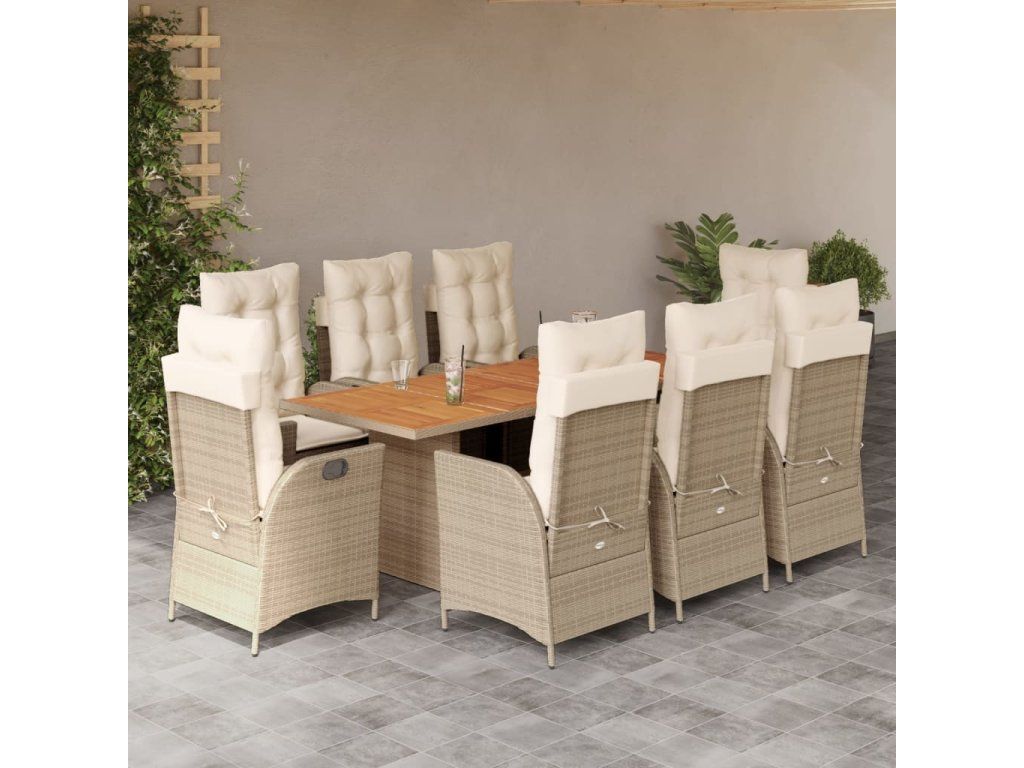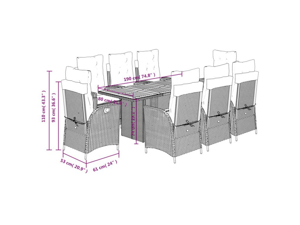 - Materiál: PE ratan, práškově lakovaná ocel, masivní akáciové dřevo s olejovou povrchovou úpravou