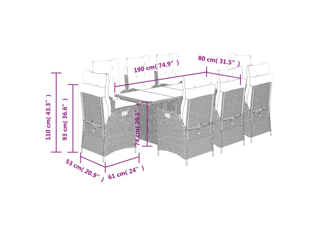 - Rozměry: 190 x 80 x 74 cm (D x Š x V)
