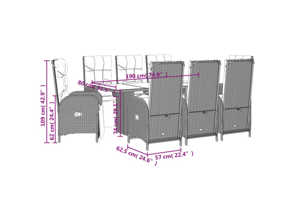 - Materiál: PE ratan, práškově lakovaná ocel, masivní akáciové dřevo s olejovou povrchovou úpravou