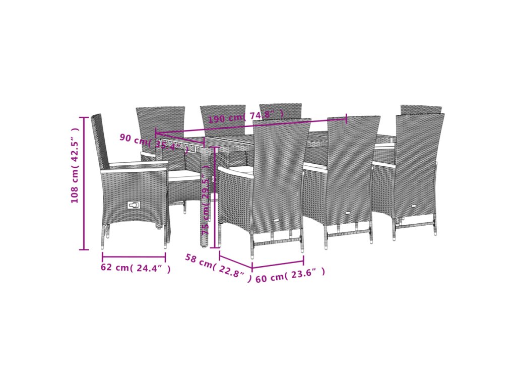 - Materiál: PE ratan, práškově lakovaná ocel, masivní akáciové dřevo s olejovou povrchovou úpravou