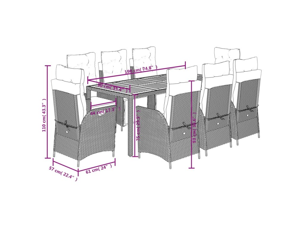 - Materiál: PE ratan, práškově lakovaná ocel, masivní akáciové dřevo s olejovou povrchovou úpravou