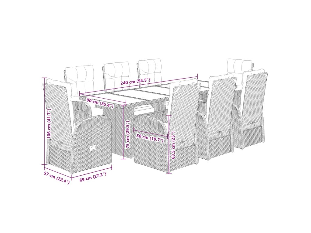- Rozměry: 240 x 90 x 75 cm (D x Š x V)