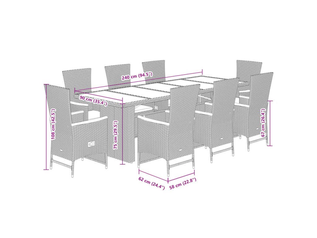 - Materiál: PE ratan, práškově lakovaná ocel, masivní akáciové dřevo s olejovou povrchovou úpravou