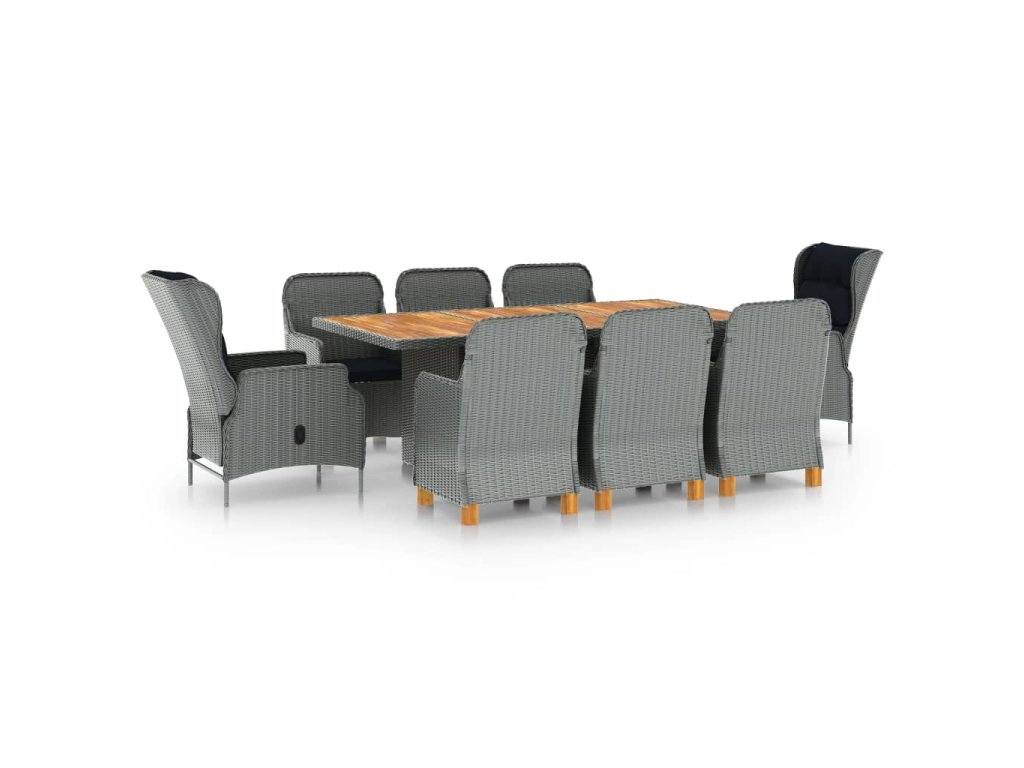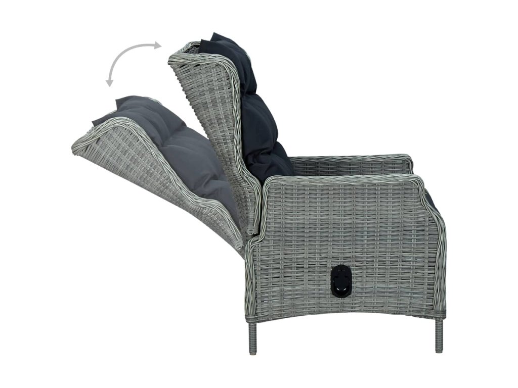 Zahradní nábytek je vyrobený z lehkého kulatého PE ratanu, který nevyžaduje téměř žádnou údržbu a snadno se čistí vlhkým hadříkem. Skvěle se proto hodí pro venkovní použití. Židle i stůl mají rám z práškově lakované oceli, což jim zajišťuje výtečnou stabilitu a odolnost. Stolní deska z masivního dřeva je ideální k podávání večeře nebo k vystavení dekorativních předmětů. Hustě polstrované podušky vám při odpočinku poskytnou maximální pohodlí. Jejich potahy jsou opatřené zipem, takže je můžete snadno sejmout a vyprat. Mechanismus s plynovým pístem umožňuje nastavit opěradlo polohovací židle do různých pozic. Stisknutím bočního tlačítka můžete opěradlo sklopit a příjemně se natáhnout.