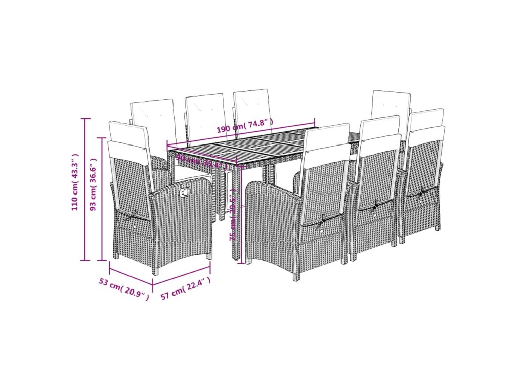 - Materiál: PE ratan, práškově lakovaná ocel, masivní akáciové dřevo