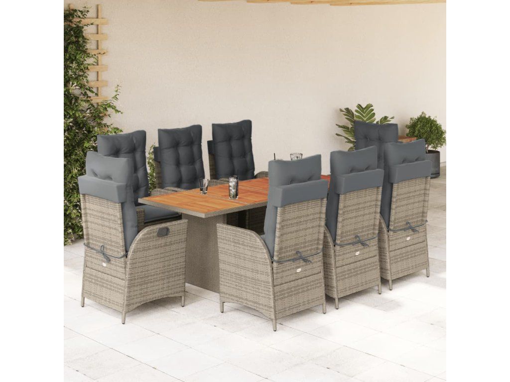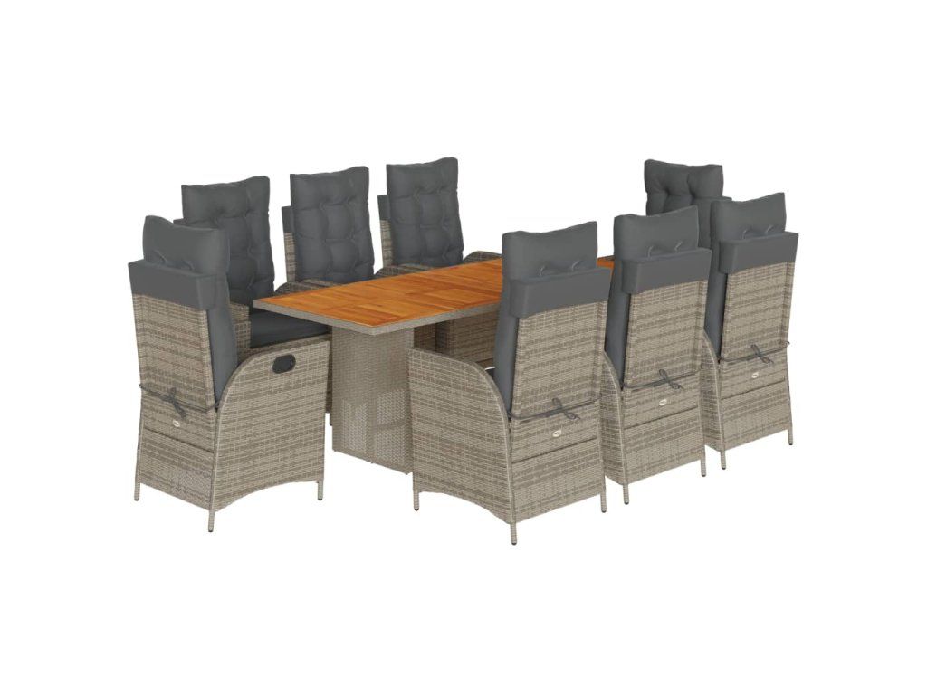 - Materiál: PE ratan, práškově lakovaná ocel, masivní akáciové dřevo s olejovou povrchovou úpravou