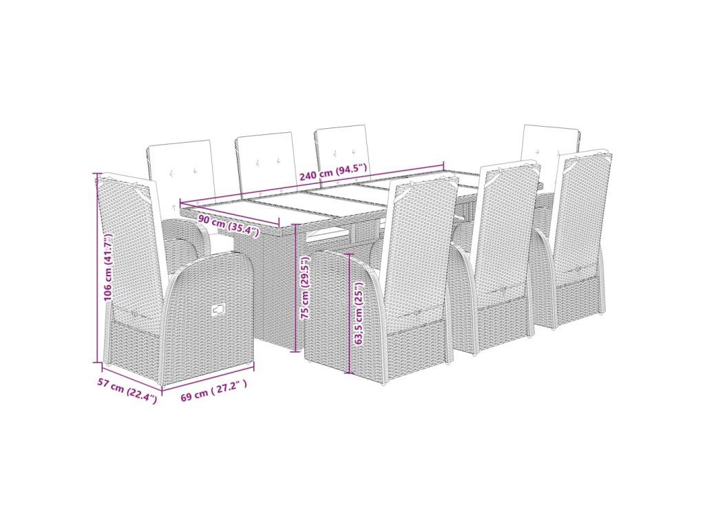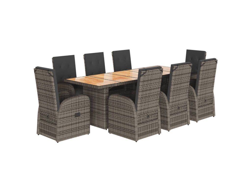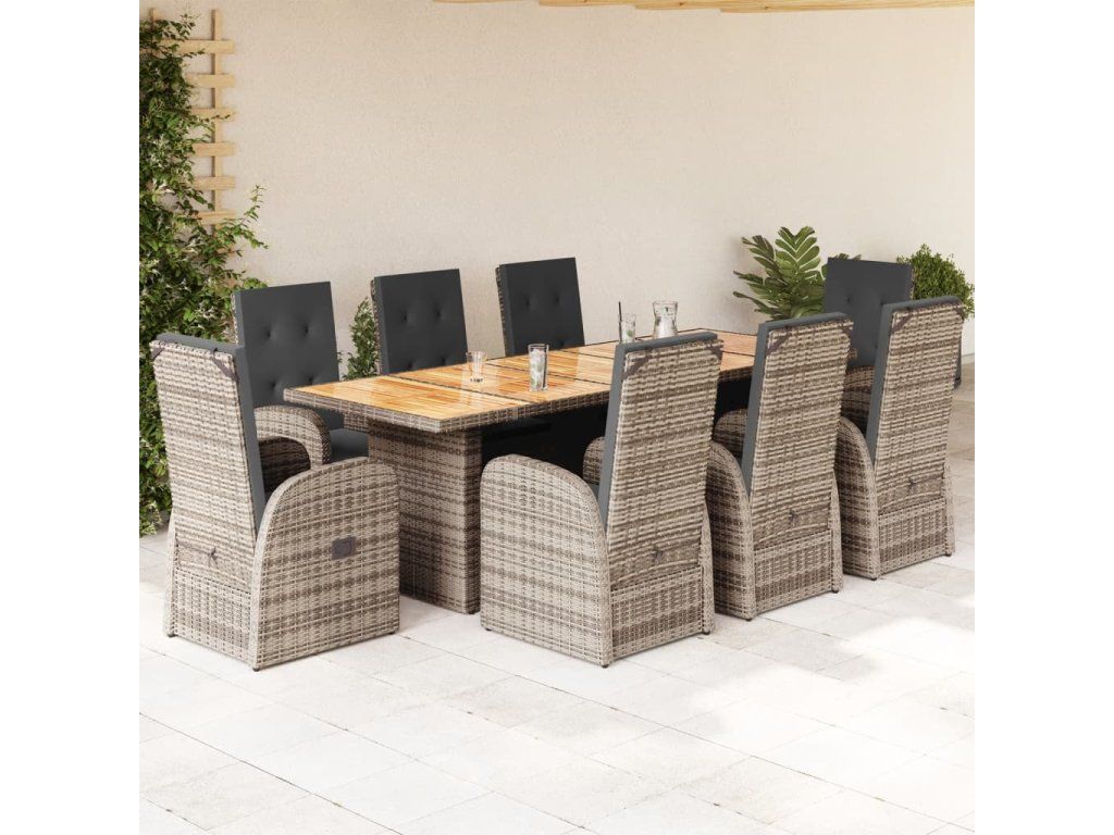 - Materiál: PE ratan, práškově lakovaná ocel, masivní akáciové dřevo s olejovou povrchovou úpravou