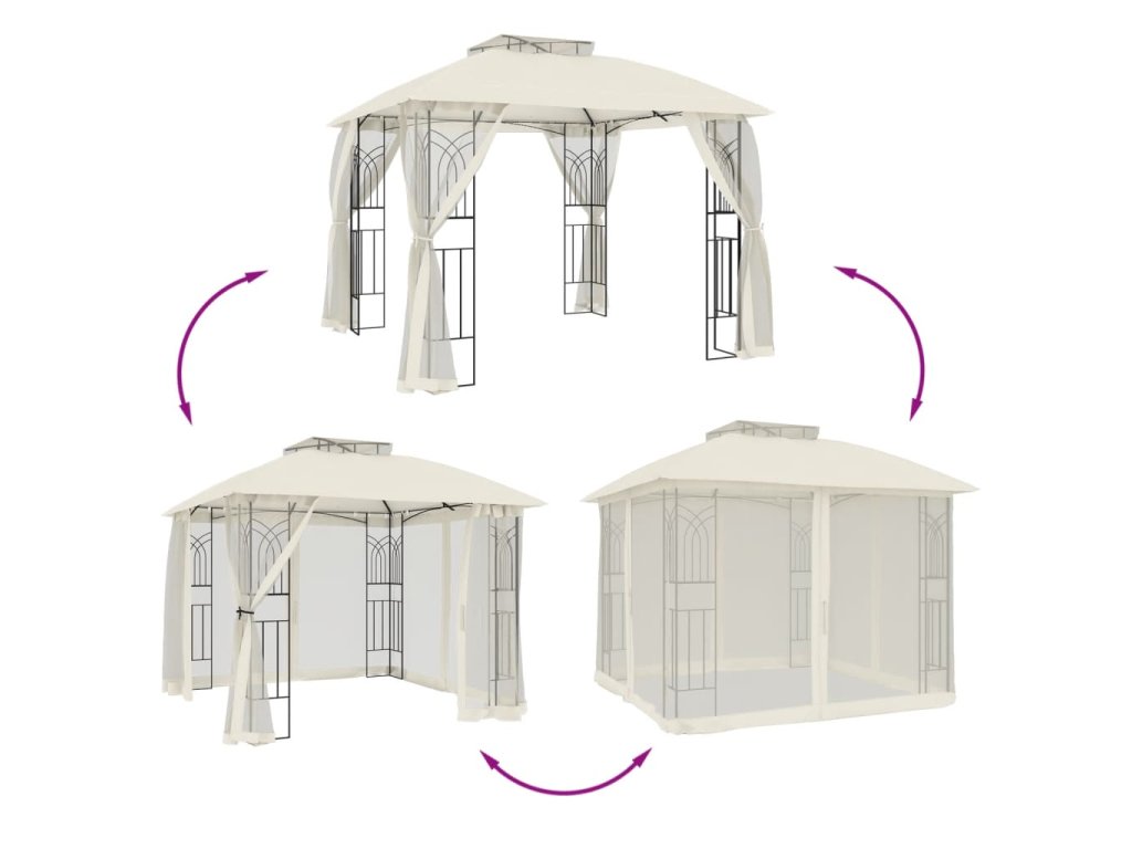 - Dvouúrovňová odvětrávaná střešní konstrukce: Altán má elegantní dvouvrstvou konstrukci, která zajišťuje skvělou ventilaci a stabilitu, udržuje vás v chladu za slunečných dnů a posiluje odolnost proti větru za nepříznivého počasí.