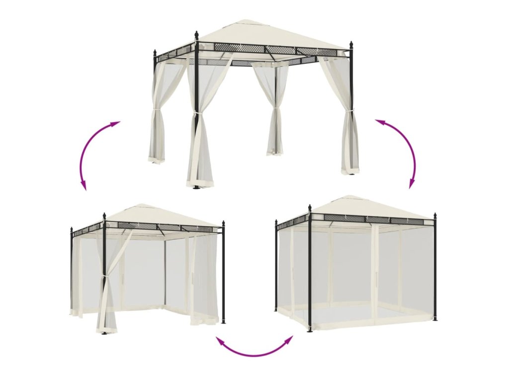 - Robustní a odolný rám: Rám je vyroben z nerezavějící oceli a je vhodný pro dlouhodobé venkovní použití. Zaručuje stabilitu díky pevným nosníkům, které podpírají střechu, a zesíleným stojkám.