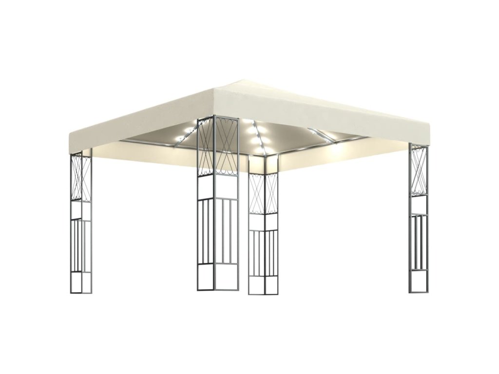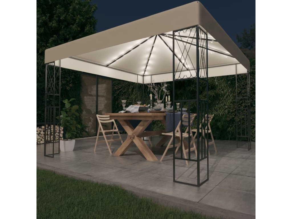 Užijte si vaše rodinné sešlosti, grilovačky, odpolední pikniky či narozeninové oslavy bez obav – tento plátěný a odvětrávaný altán vás totiž spolehlivě ochrání před sluncem i deštěm. Zahradní stan má pevnou ocelovou konstrukci s dekorativními křížovými ornamenty a polyesterovou střechu. Ta má zesílené rohy a lze ji na ocelový rám snadno připevnit. A to není vše! Až zapadne slunce, světelný řetěz vytvoří ve vaší zahradě útulnou atmosféru. Světla nepředstavují zátěž pro životní prostředí, jelikož se ve dne nabíjí solární energií.