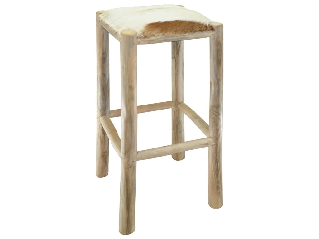 Naše barová stolička má pevný rám z teaku a je stabilní a odolná. Sedák je čalouněný pevnou, odolnou a poddajnou 100% pravou kozí kůží s kozím vzorem. Kůže s chlupem je měkká a příjemná na dotek. Krásný přirozený vzor kůže každé stoličky je unikátní a lehce odlišný od všech ostatních. Sedák má měkké polstrování, takže se na něm krásně sedí. Nohy ze dřeva v přírodní barvě jen podtrhují rustikální vzhled stoličky.
