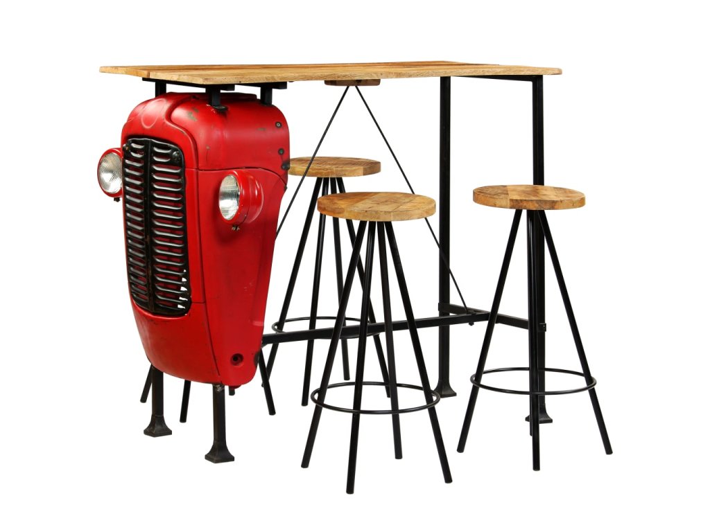 Tento barový set ve vintage stylu, sestávající z 1 barového stolu s designem traktoru a 4 barových židlí, oplývá industriálním stylem a zaujme ve vaší kuchyni či jídelně na první pohled.