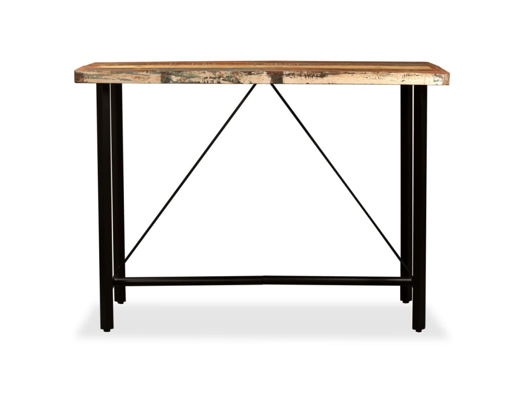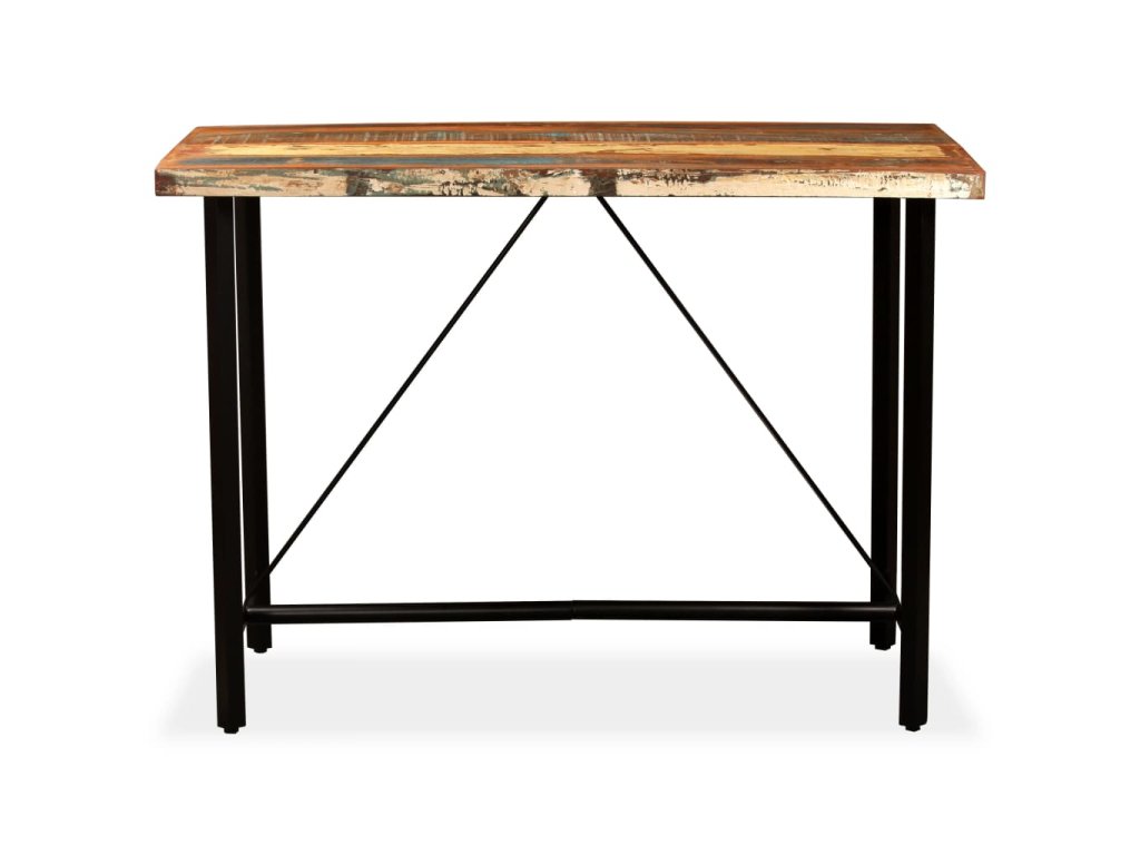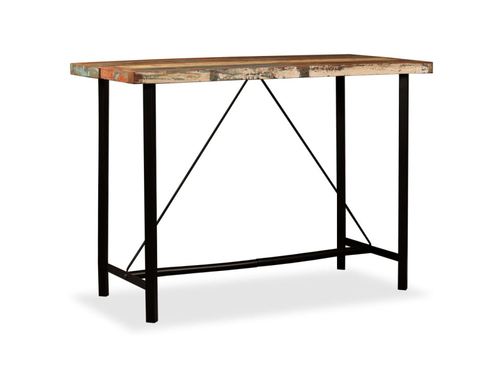 Barový stůl je vyrobený z masivního recyklovaného dřeva, takže má vlastnosti různých dřevin, jako jsou teak, mangovníkové dřevo, akácie atd. Recyklované dřevo je pevné, stabilní, odolné a také krásné. Známky opotřebení a řemeslného zpracování dávají každému kusu nábytku jedinečný charakter. Stůl je navíc celý ručně vyrobený. Silné ocelové nohy zajišťují stabilitu a odolnost stolu a umocňují jeho působivý industriální styl. Důležité upozornění: Kresba a odstín dřeva se mohou lišit kus od kusu, a proto je každý kus nábytku naprosto jedinečný. Výběr kusu k dodání je náhodný.