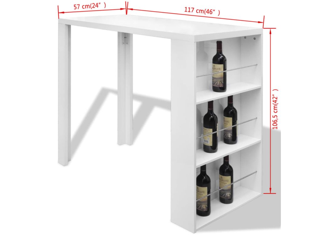 Tento vysoce lesklý barový stůl je perfektní alternativou pro malé byty nebo jiné omezené prostory. Současný design stolku stylově doplní zařízení vaší kuchyně nebo jídelního koutu. Třípatrový regál nabízí spoustu místa pro vaše vinné lahve nebo jiné věci.