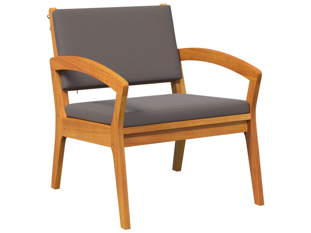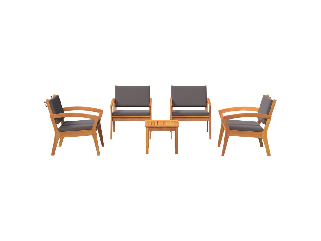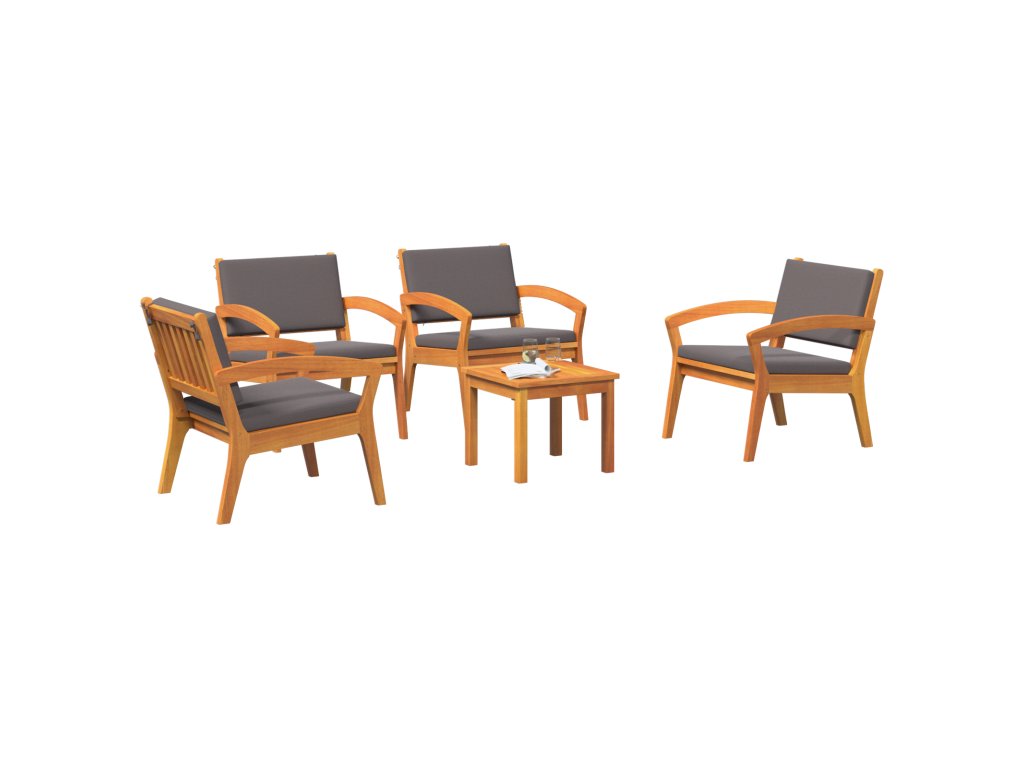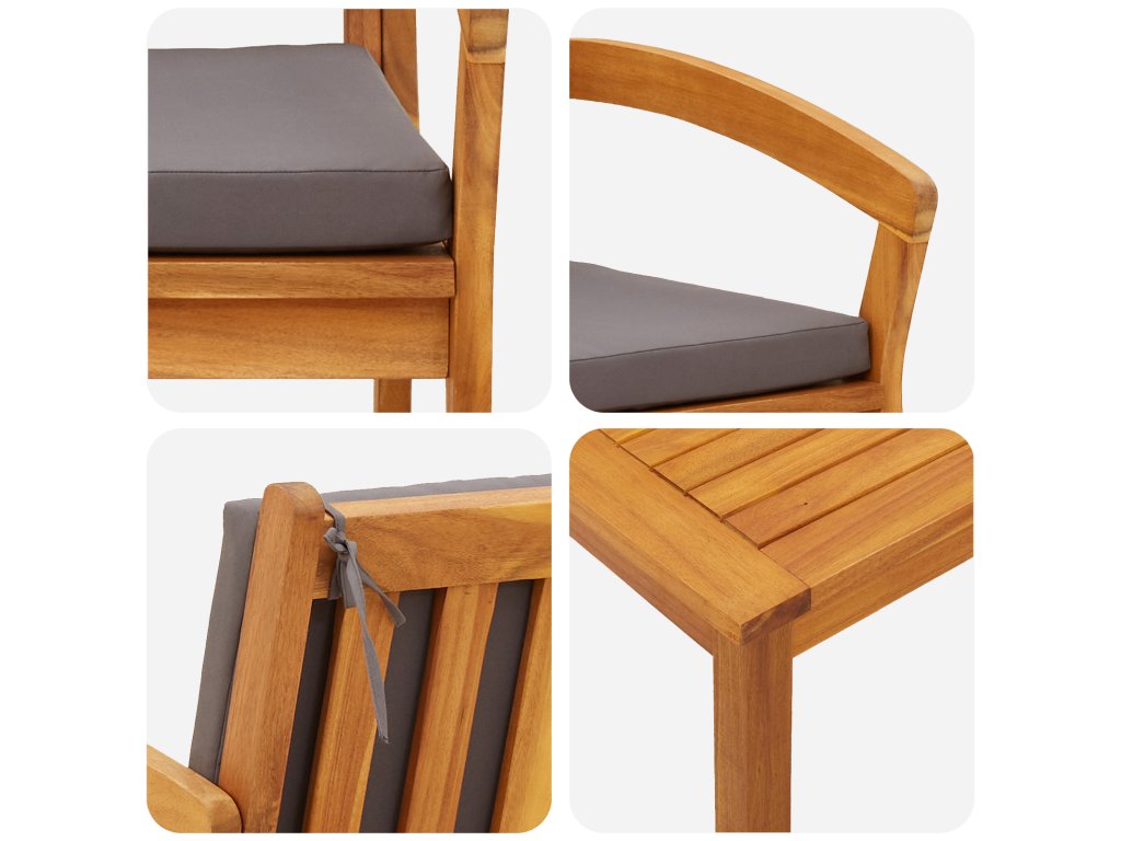 Tento 5dílný bistro set kombinuje styl a pohodlí a skvěle se hodí jak dovnitř, tak ven. Dělaný z masivního akáciového dřeva a tmavě šedých polštářů, vytváří krásné místo pro relaxaci, ať už na balkóně, nebo v obýváku.