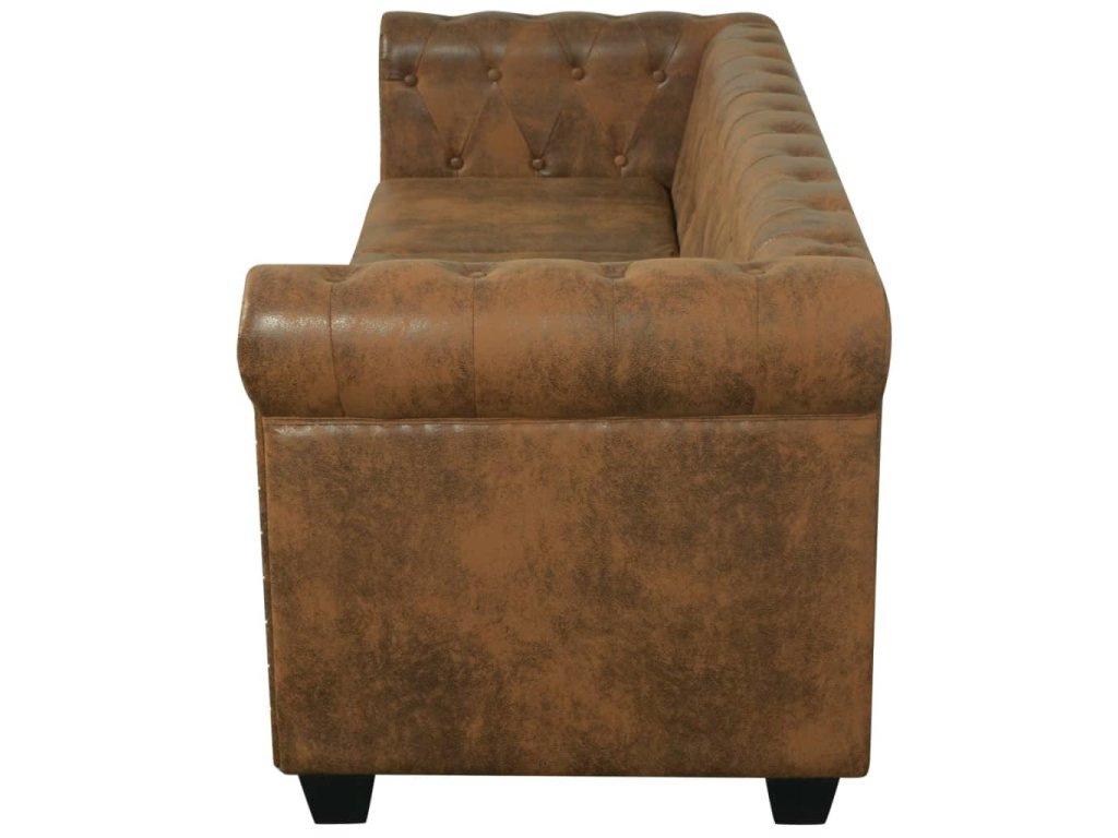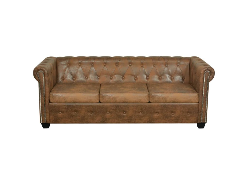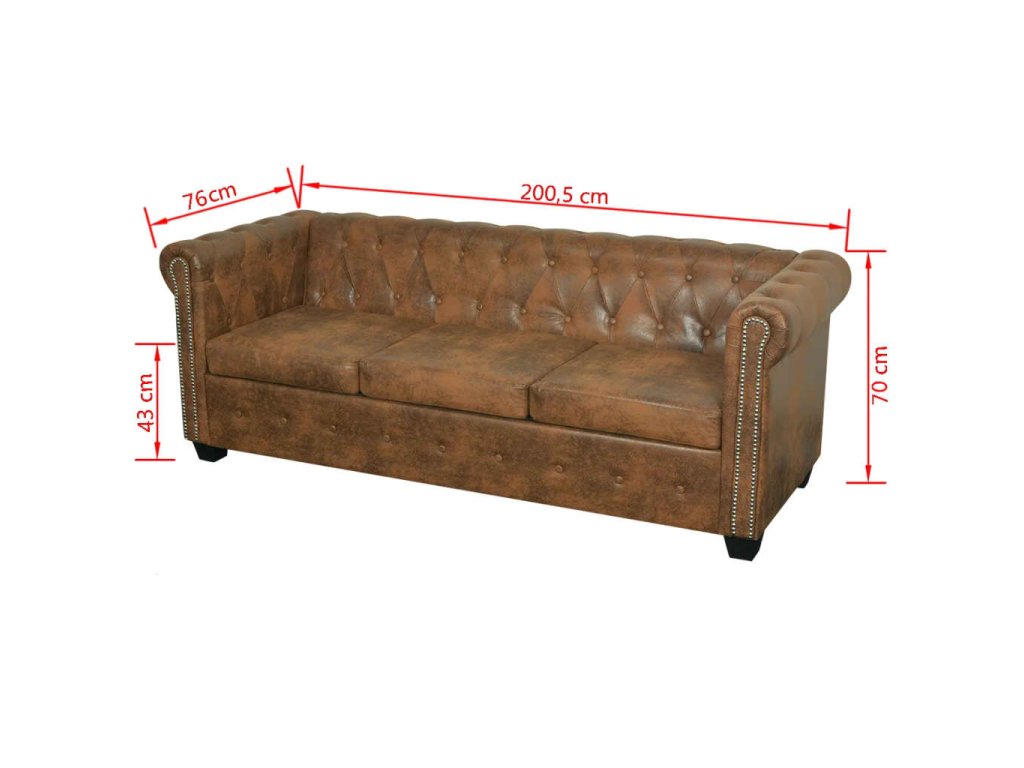 Tato sedačka Chesterfield je perfektní kombinací pohodlí a sofistikovanosti a bude skvělým doplňkem do každého domova či kanceláře. Tato 3místná pohovka s ozdobným prošíváním a cvočky a půvabně zakřivenými područkami dodá každému interiéru nádech luxusu a stylu.