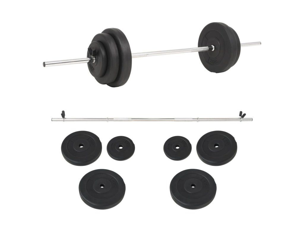 Tato všestranná činková sada je ideální pro cvičení zaměřené na hruď, biceps, paže, triceps a zádové svalstvo. Obsahuje dva 7,5kilové kotouče, dva 5kilové kotouče, dva 1,25kilové kotouče a jednu činkovou tyč o hmotnosti 2 kg. Celková váha činek je zhruba 30 kg.