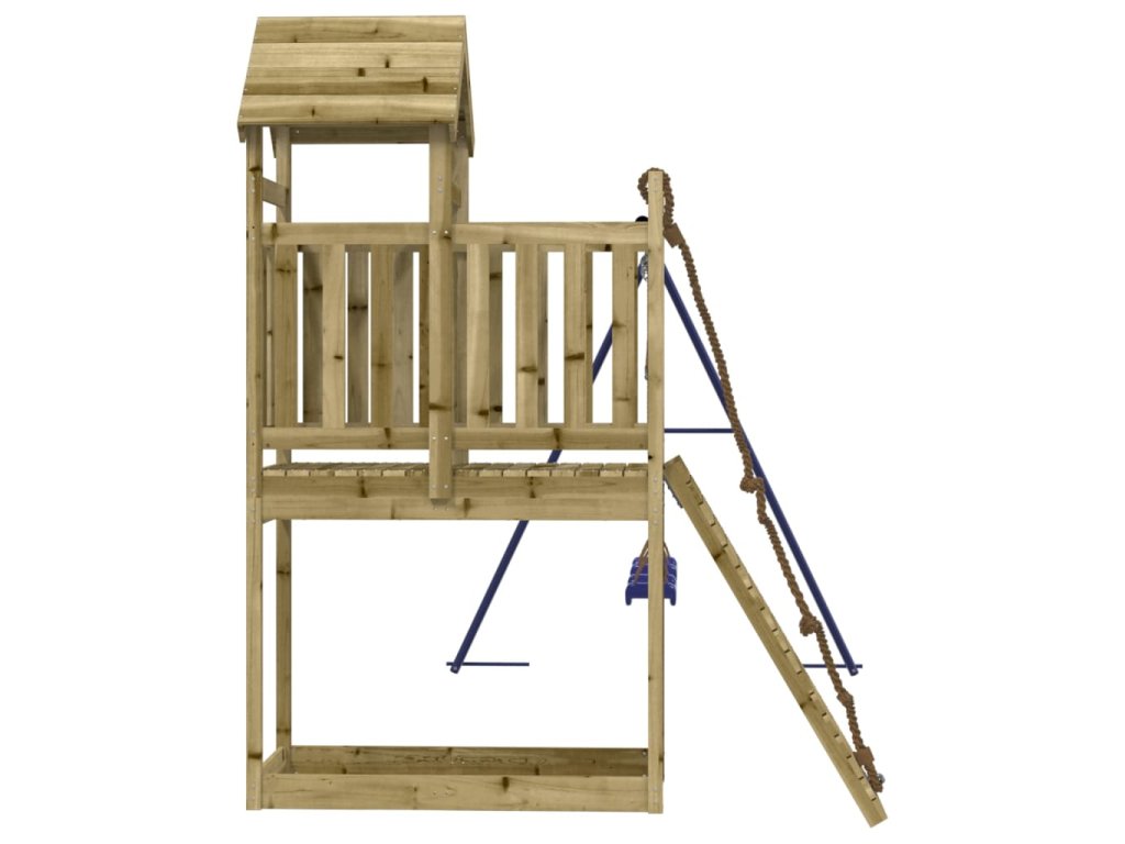 - Promyšlený design: Dřevěné zábradlí je navrženo tak, aby zajistilo bezpečnost dětí při jejich veselých hrách. Dřevěná střecha navíc poskytuje stín pro vaše děti v horkých letních dnech.