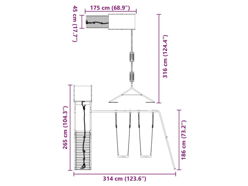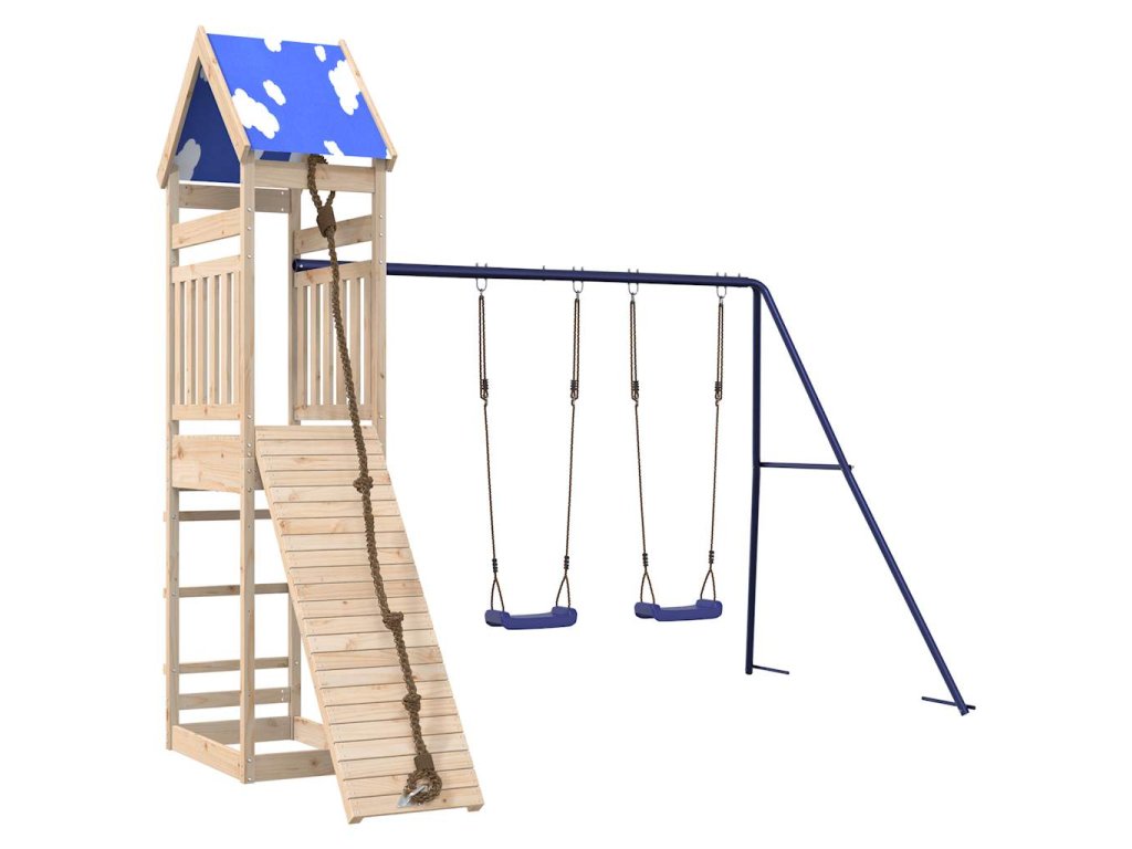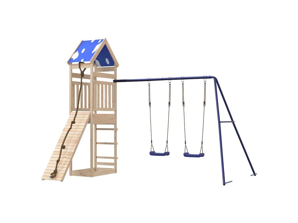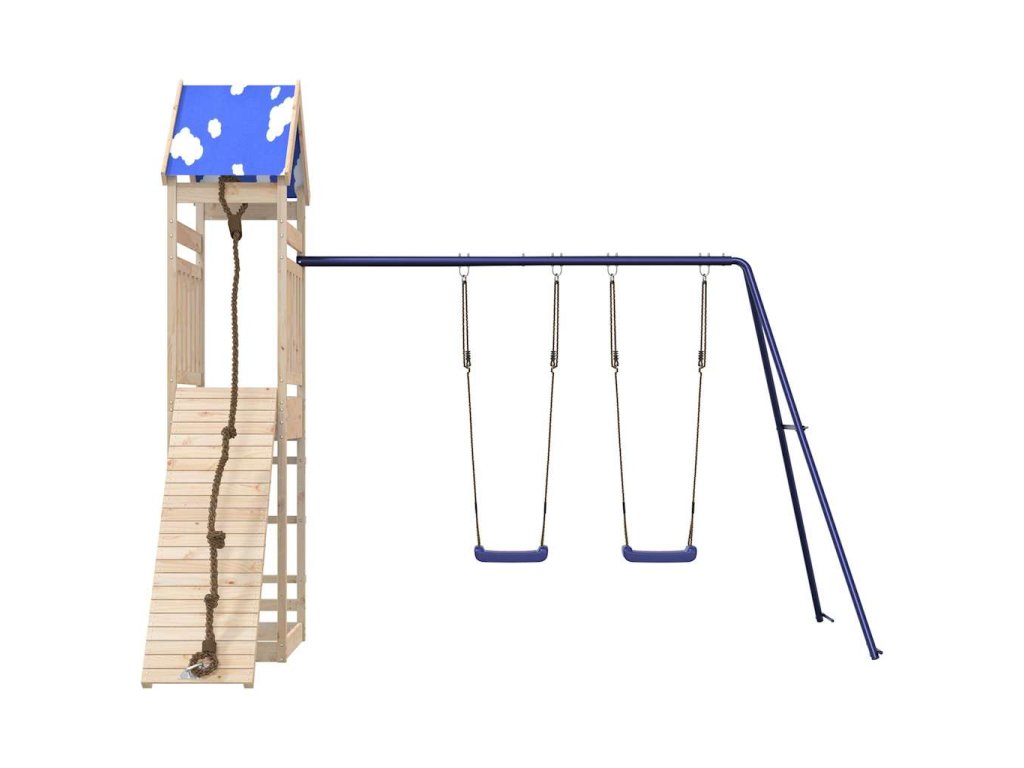 - Stabilní dřevěný rám: Dřevěný rám zahradní hrací věže zajišťuje mimořádnou pevnost a stabilitu. Nohy dětské houpačky ve tvaru písmene A navíc zajišťují potřebnou rovnováhu.
