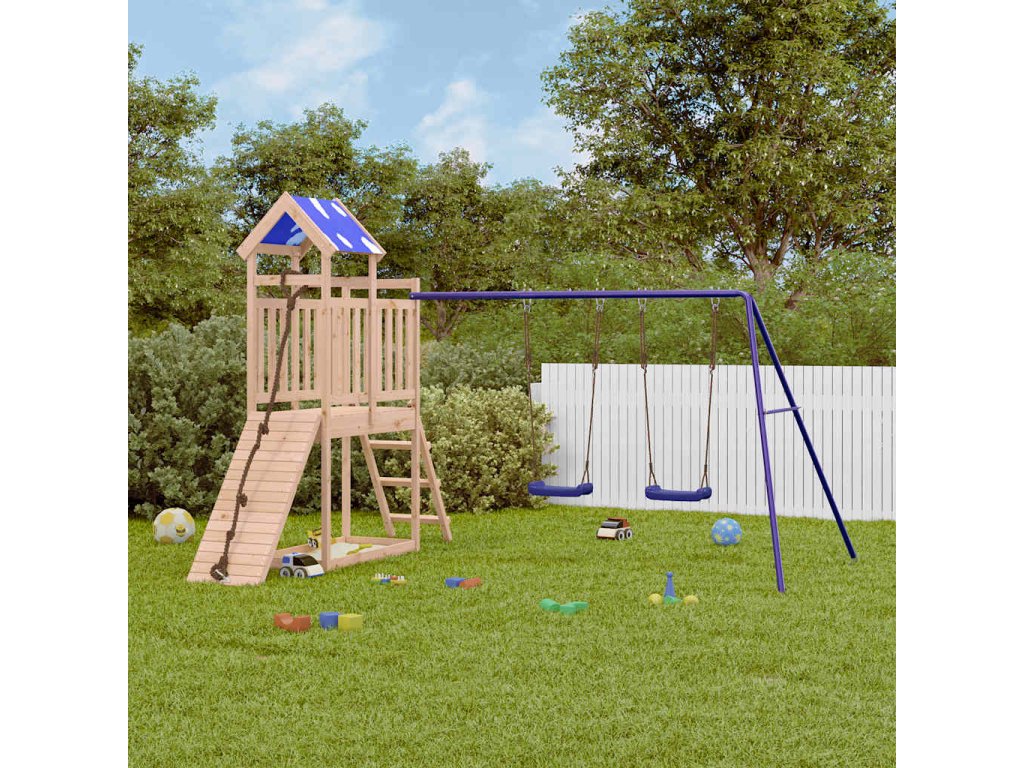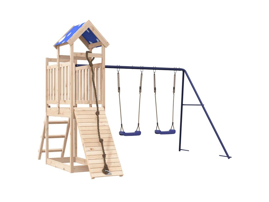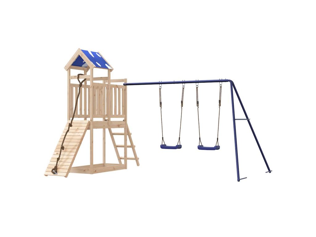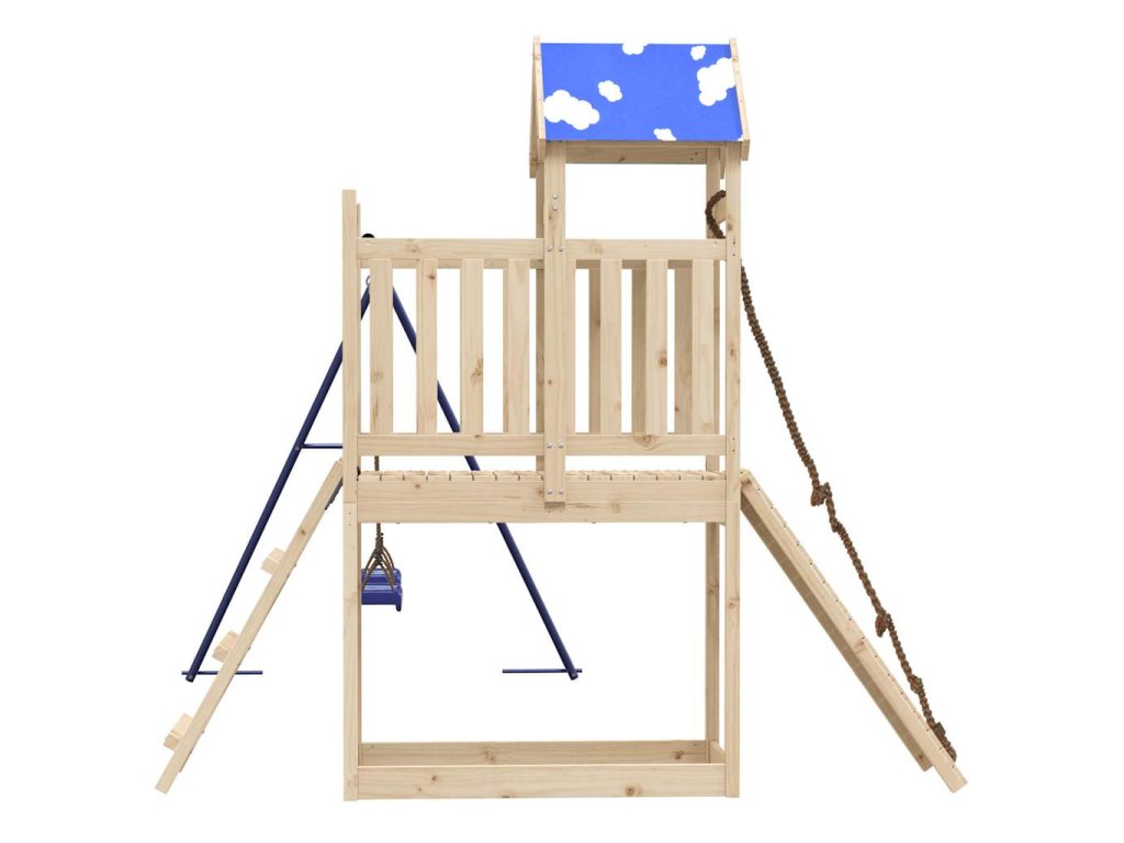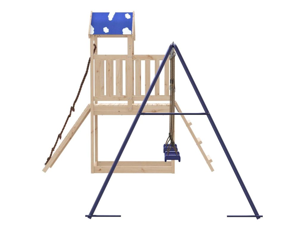 - Odolný materiál: Rám tohoto zahradního hřiště je vyroben z masivního borového dřeva. Masivní borové dřevo je známé svou pevností a dlouhou životností. Jeho rovná textura a výrazné suky přispívají k jeho rustikálnímu kouzlu.