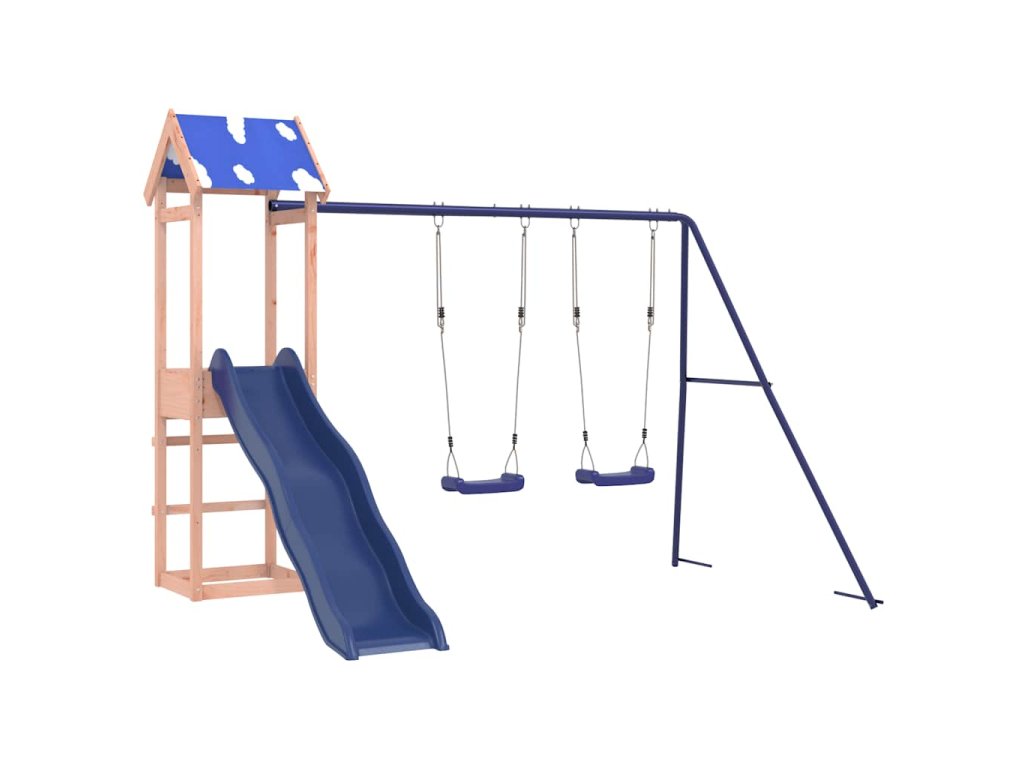 - Odolný materiál: Rám tohoto zahradního hřiště je vyroben z masivního dřeva douglasky. Douglaska je známá svou pevností a dlouhou životností. Jeho sytá červenohnědá barva a jedinečná kresba dřeva působí hřejivým a přírodním dojmem. Vyznačuje se dobrou stabilitou a odolností vůči povětrnostním vlivům, takže je ideální pro výrobu interiérového i venkovního nábytku.
