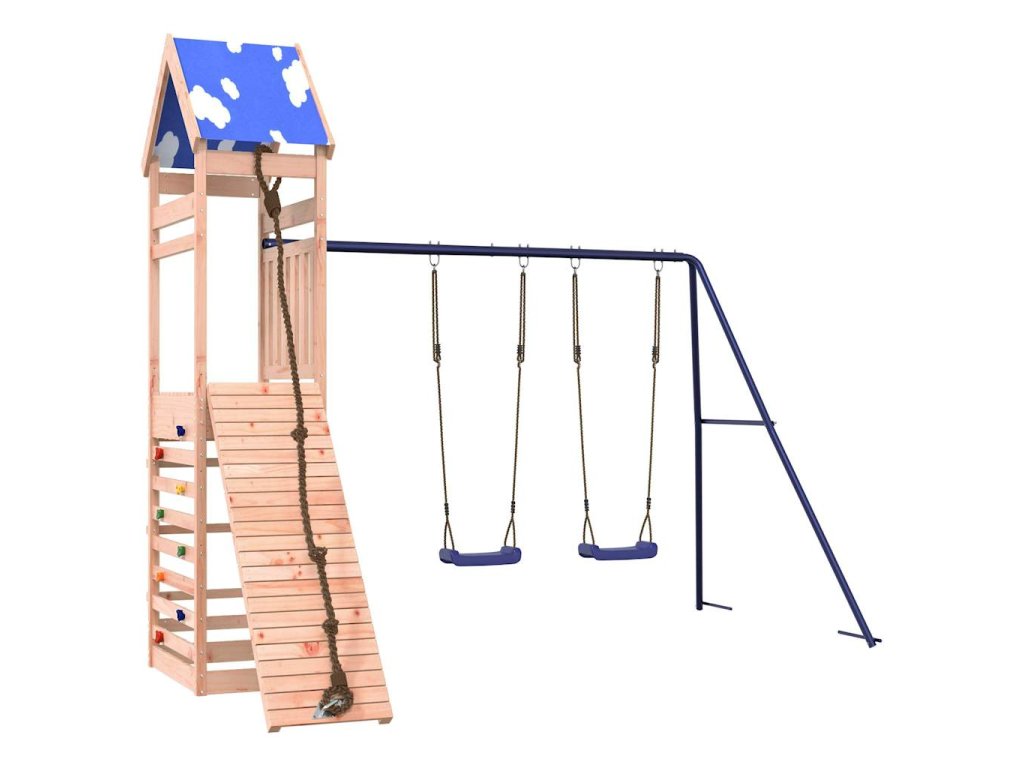 - Odolný materiál: Rám tohoto zahradního hřiště je vyroben z masivního dřeva douglasky. Douglaska je známá svou pevností a dlouhou životností. Jeho sytá červenohnědá barva a jedinečná kresba dřeva působí hřejivým a přírodním dojmem. Vyznačuje se dobrou stabilitou a odolností vůči povětrnostním vlivům, takže je ideální pro výrobu interiérového i venkovního nábytku.