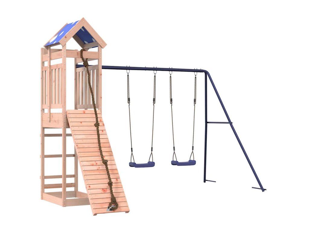 - Odolný materiál: Rám tohoto zahradního hřiště je vyroben z masivního dřeva douglasky. Douglaska je známá svou pevností a dlouhou životností. Jeho sytá červenohnědá barva a jedinečná kresba dřeva působí hřejivým a přírodním dojmem. Vyznačuje se dobrou stabilitou a odolností vůči povětrnostním vlivům, takže je ideální pro výrobu interiérového i venkovního nábytku.
