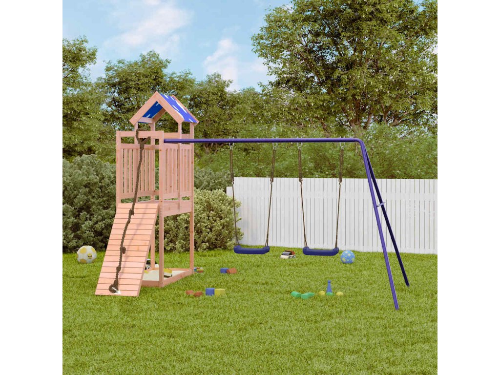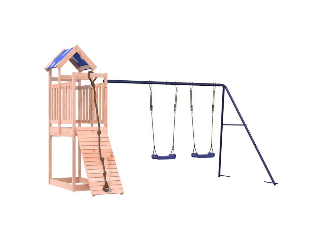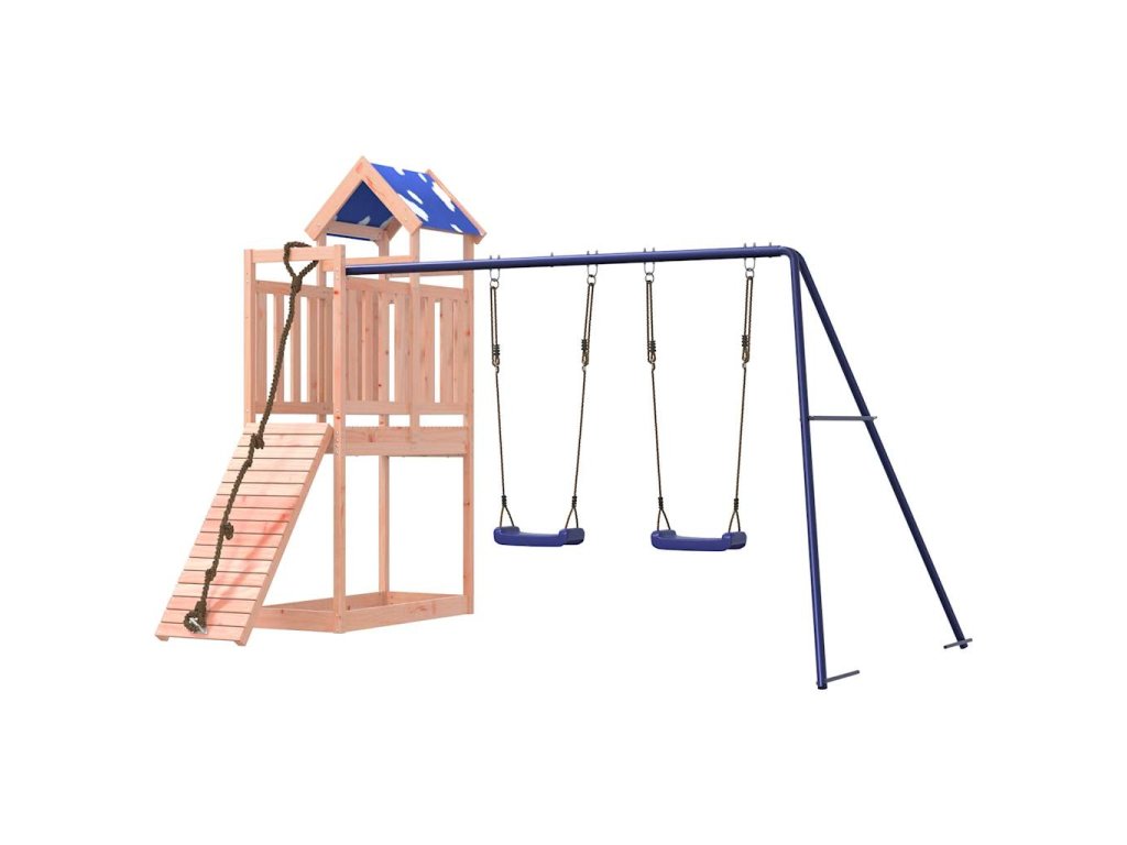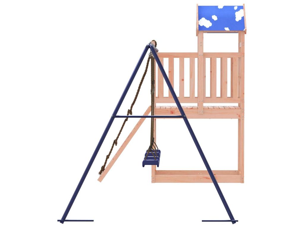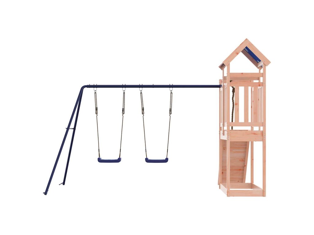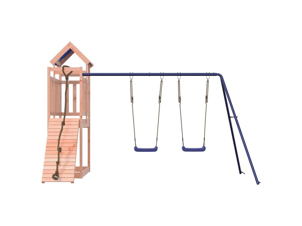 - Odolný materiál: Rám tohoto zahradního hřiště je vyroben z masivního dřeva douglasky. Douglaska je známá svou pevností a dlouhou životností. Jeho sytá červenohnědá barva a jedinečná kresba dřeva působí hřejivým a přírodním dojmem. Vyznačuje se dobrou stabilitou a odolností vůči povětrnostním vlivům, takže je ideální pro výrobu interiérového i venkovního nábytku.