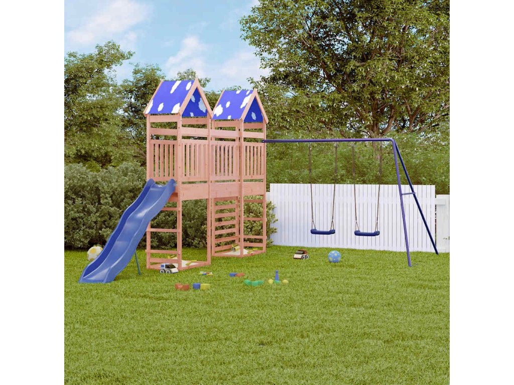 - Odolný materiál: Rám tohoto zahradního hřiště je vyroben z masivního dřeva douglasky. Douglaska je známá svou pevností a dlouhou životností. Jeho sytá červenohnědá barva a jedinečná kresba dřeva působí hřejivým a přírodním dojmem. Vyznačuje se dobrou stabilitou a odolností vůči povětrnostním vlivům, takže je ideální pro výrobu interiérového i venkovního nábytku.