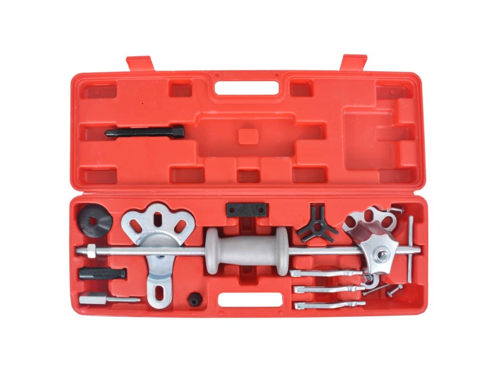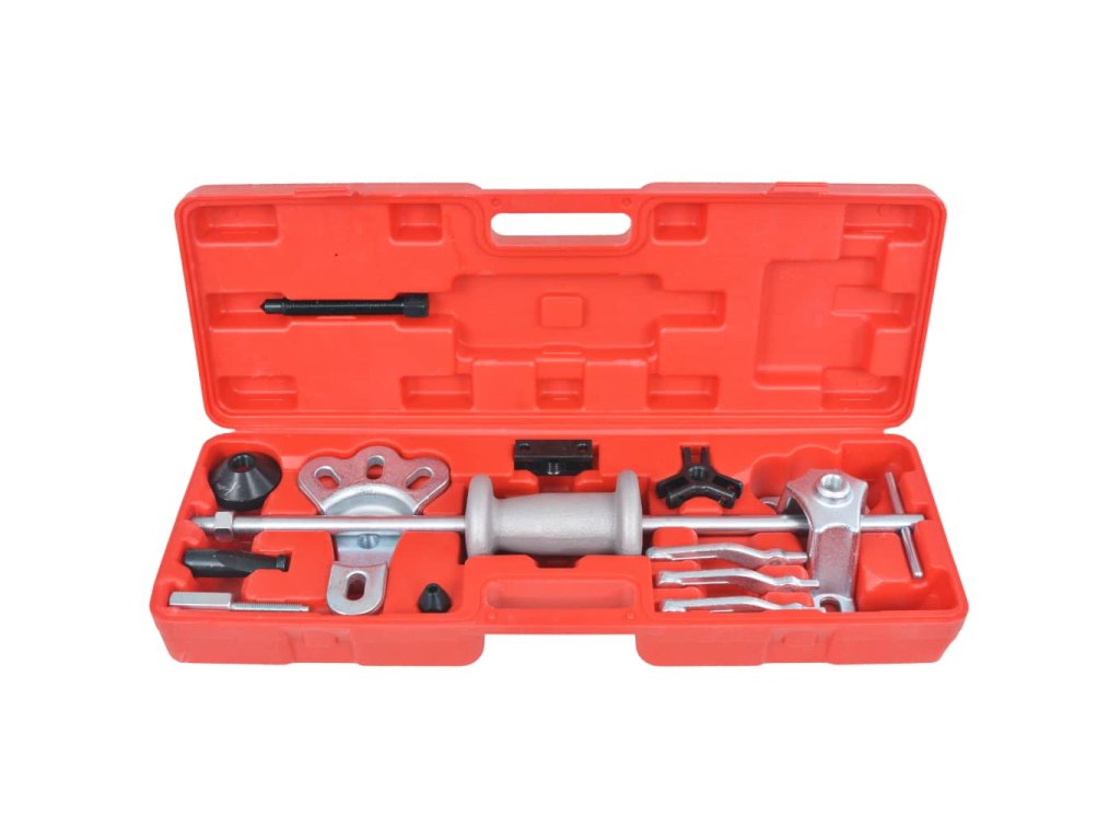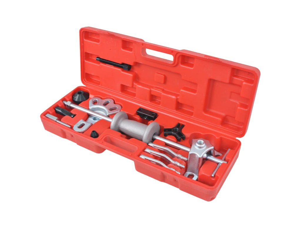 Tato sada devíticestného kluzného kladiva a stahováků je ideální pro mnoho prací na autě, jako je stahování zadních náprav přírubového typu a nábojů předních kol.