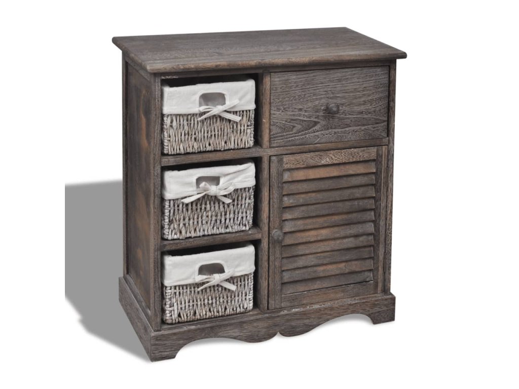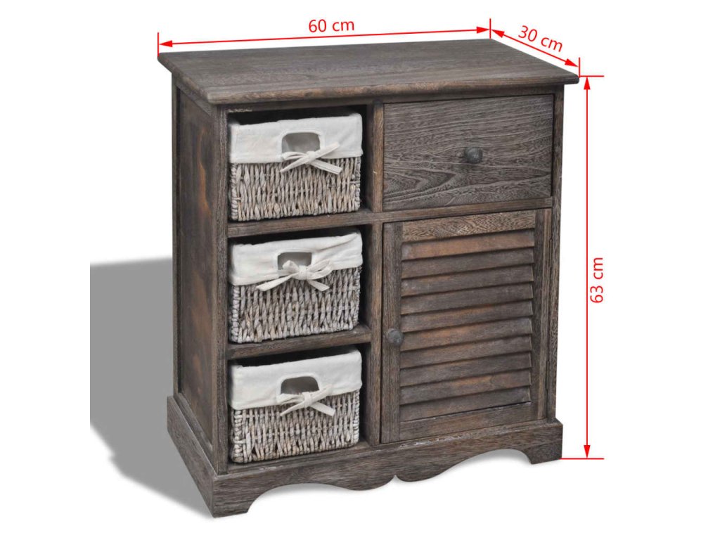 Tato odolná dřevěná skříňka, která se dodává se třemi pletenými košíky, vám poskytne spoustu místa pro uložení vašich cenností a zároveň vnese do vašeho pokoje venkovský styl. Naše dřevěná skříňka bude jistě jedním z vašich oblíbených kusů nábytku v jakémkoli pokoji.