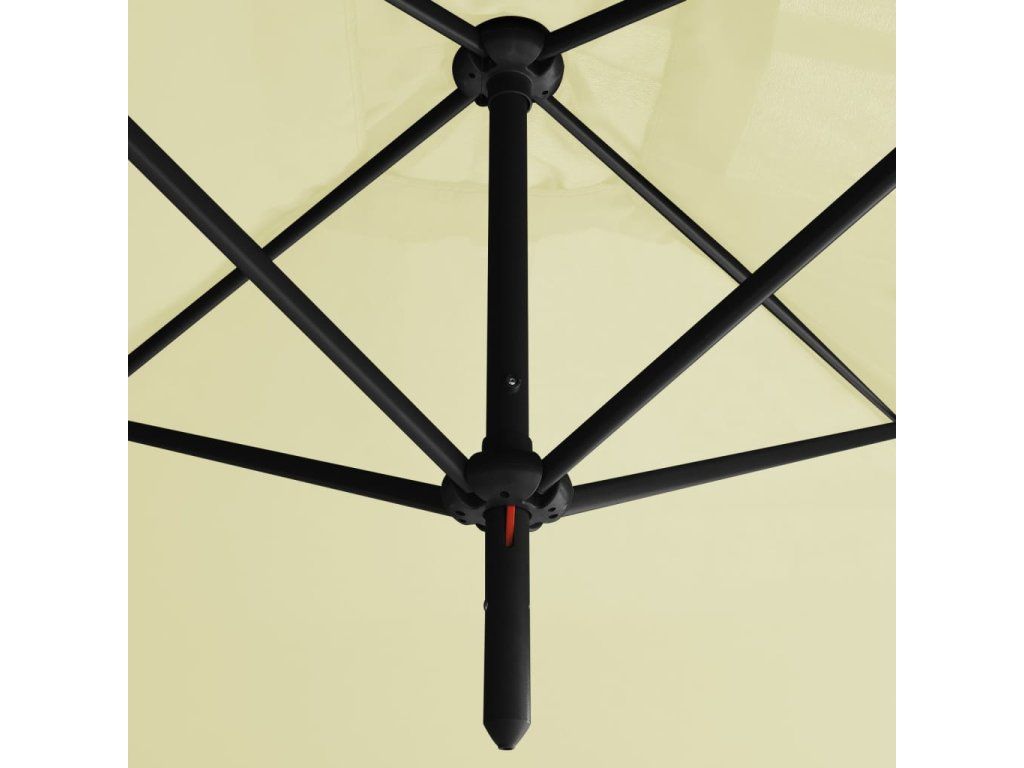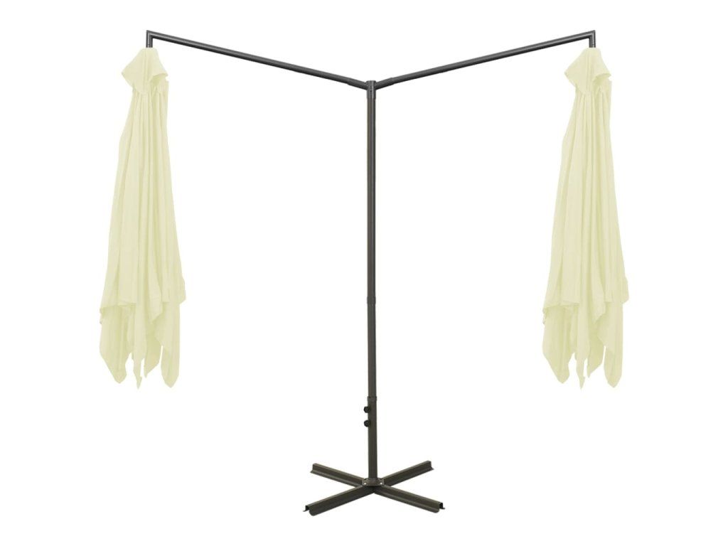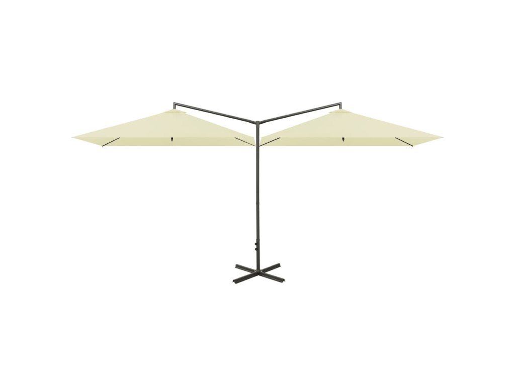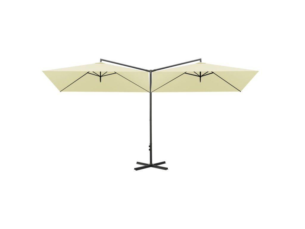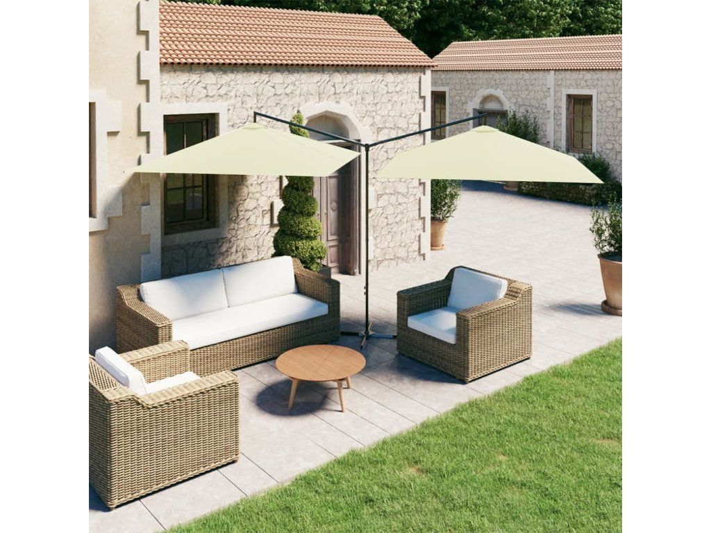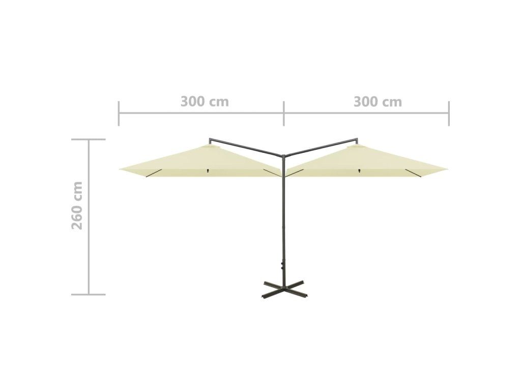 Tento slunečník je vyrobený z polyesteru, který vám poskytuje optimální ochranu před spálením od sluníčka. Robustní ocelová tyč spolu s tuhými ocelovými žebry udržuje slunečník stabilní. Slunečník je vybaven ocelovou křížovou základnou pro větší stabilitu. Konstrukce dvou vedle sebe umístěných stříšek je praktická, elegantní a jedinečná. Nejenže vám poskytne více stínu, ale také upoutá pozornost v jakémkoli venkovním bydlení. Kromě toho se snadno otevírá a zavírá.