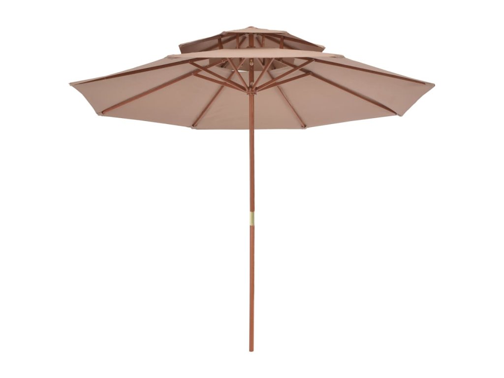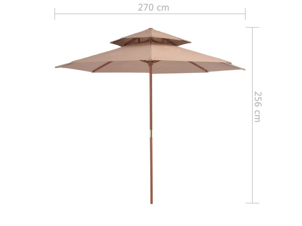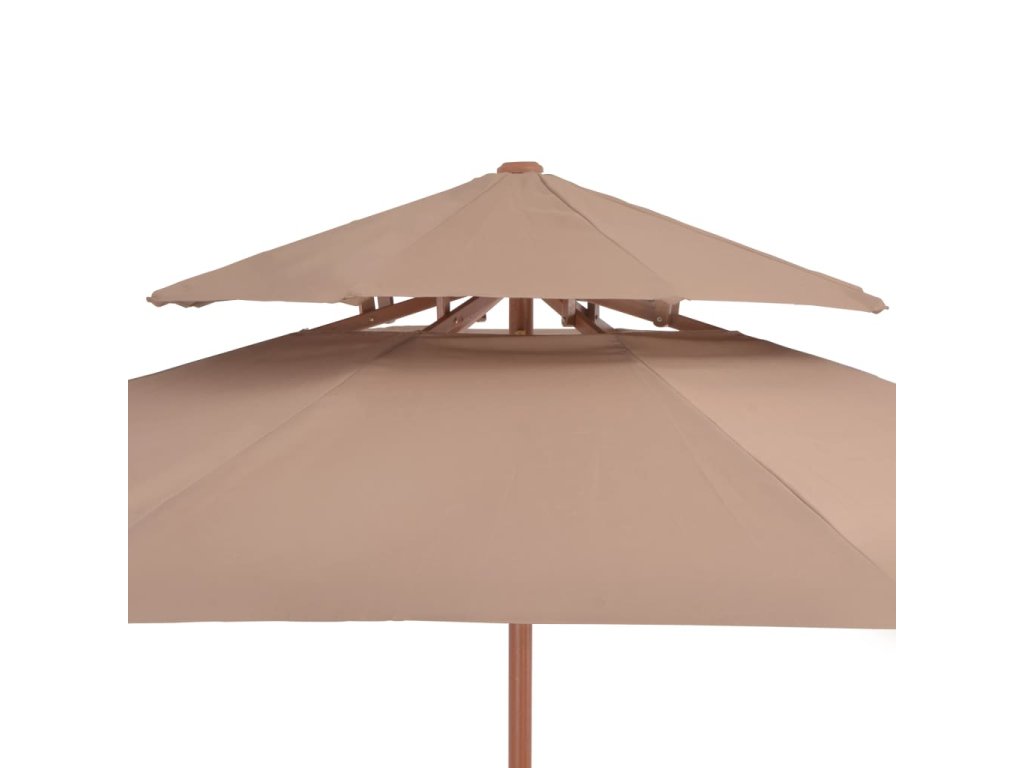 Stříška slunečníku je vyrobena z polyesterové tkaniny, která nepropouští škodlivé UV záření a nevybledne, a poskytne vám optimální ochranu před sluncem. Navíc se snadno čistí. Průměr tyče je 38 mm a můžete ji namontovat na stávající stojan nebo doprostřed stolů, které na ni mají otvor. Silná dřevěná tyč s 8 odolnými žebry zajišťuje, že se slunečník nehýbe a hodně toho vydrží. Dvoupatrová konstrukce umožňuje během horkých dní proudění vzduchu. Slunečník disponuje jednoduchým kladkovým mechanismem, takže se snadno otevírá i zavírá. Sestavení výrobku je jednoduché.