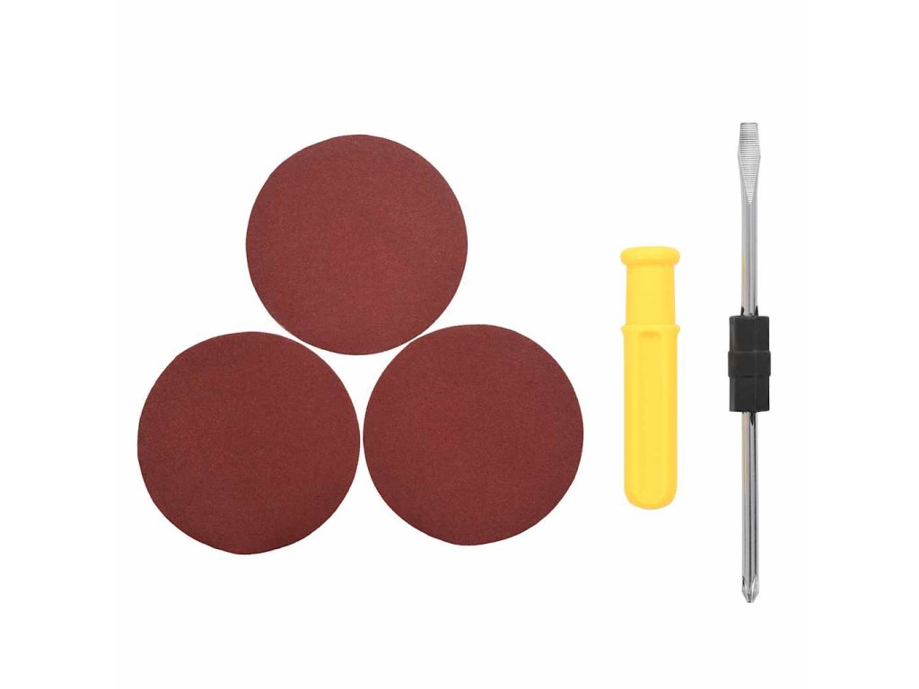 Součástí balení jsou také plastový kotouč, leštící houba, 3 brusné kotouče, pár uhlíkových kartáčů a šroubovák.