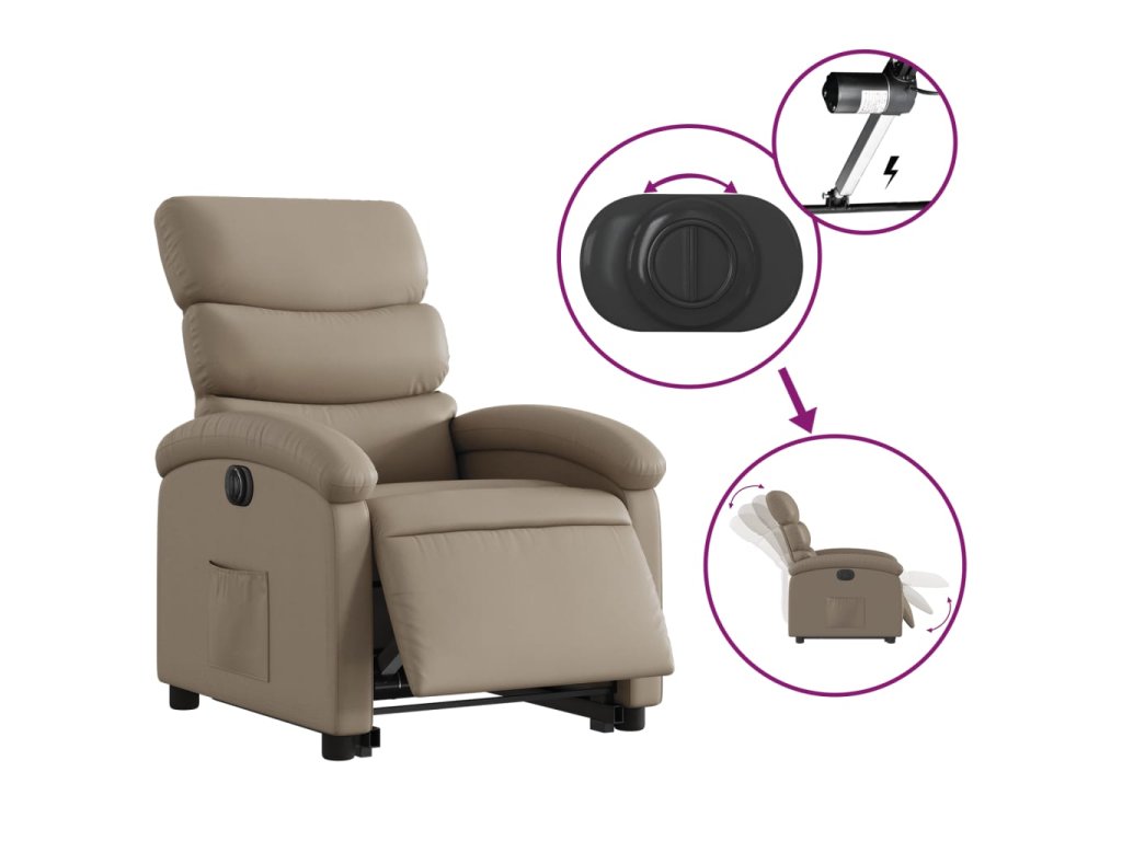 - Funkce elektrického sklápění: Toto polohovací křeslo je také vybaveno elektromotorem. Jednoduchým stisknutím tlačítka na boku křesla můžete automaticky nastavit opěrku nohou a opěradlo do libovolné polohy tak, abyste se cítili pohodlně. Tato funkce umožňuje maximální náklon 135 stupňů. Opěradlo se navíc může jednoduchým stisknutím tlačítka automaticky vrátit do původní polohy.