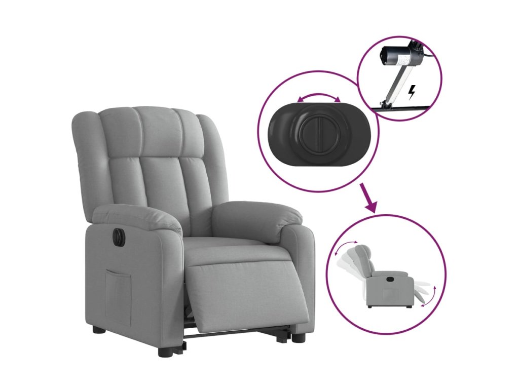 - Funkce elektrického sklápění: Toto polohovací křeslo je také vybaveno elektromotorem. Jednoduchým stisknutím tlačítka na boku křesla můžete automaticky nastavit opěrku nohou a opěradlo do libovolné polohy tak, abyste se cítili pohodlně. Tato funkce umožňuje maximální náklon 135 stupňů. Opěradlo se navíc může jednoduchým stisknutím tlačítka automaticky vrátit do původní polohy.
