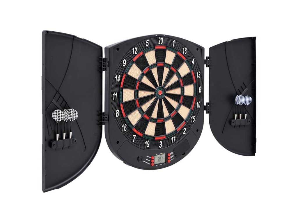- Extra ochrana: Pro prodloužení životnosti této hry je terč s LCD displejem navržen se dvěma bočními dvířky, která zvětšují okolní plochu. Obě strany lze navíc využít k uložení šipek.