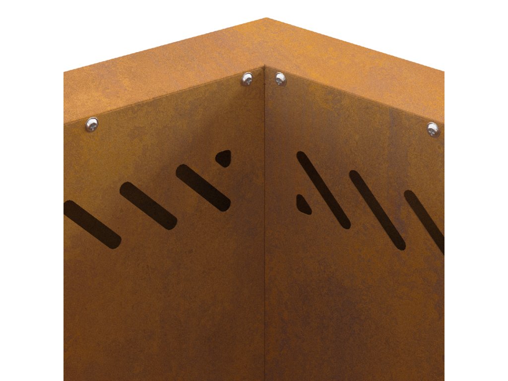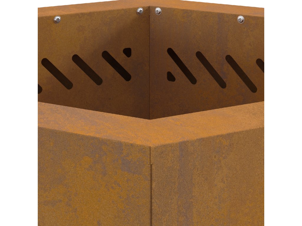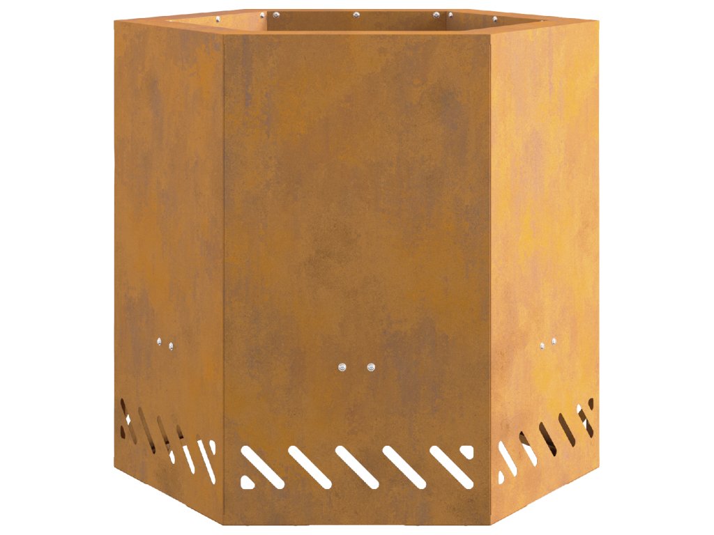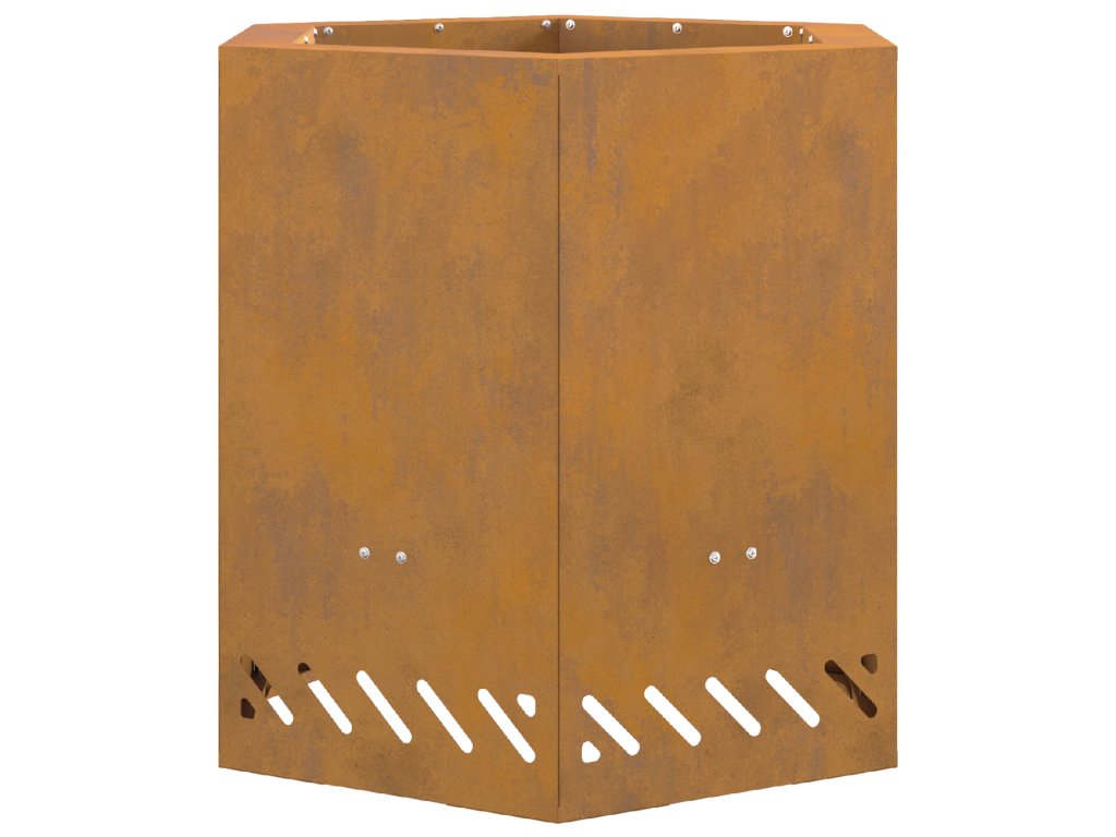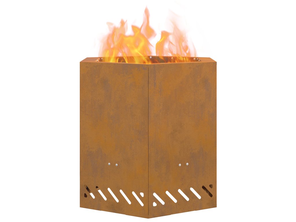 Tohle dřevěné ohniště je šestiúhelníkové, vytváří teplou atmosféru pro setkání venku a poklidné večery pod hvězdami. Vyrobeno z odolné zvětralé oceli, nejenže dobře vypadá, ale také slouží jako místo pro shromáždění tepla a světla.