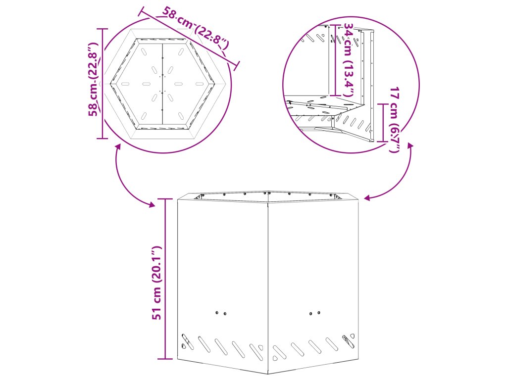 Toto ohniště bylo navrženo tak, aby odolávalo rzi, takže vaše venkovní akce mohou trvat. Podporuje velká polena pro delší hoření, takže se můžete míň starat o plamen. Drsný vzhled oceli s povrchovou úpravou mu dodává rustikální kouzlo, co se hodí k jakémukoliv venkovnímu prostředí. Prostorný šestiúhelník láká lidi k setkávání a přitahuje přátele a rodinu k teplu ohně. Ideální pro grilování na zahradě, kempování nebo pohodové večery pod hvězdami.- Barva: Hnědá
