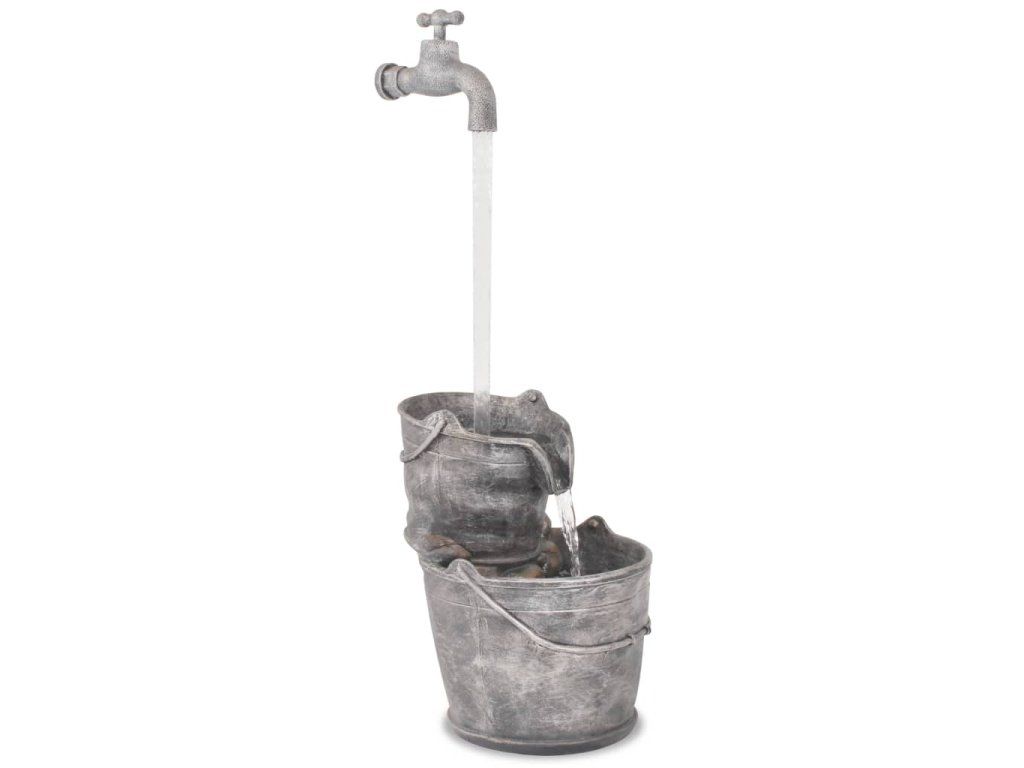 Fontánka je vyrobená z polyresinu. Její součástí je i průsvitná trubička, která propojuje kyblíky a kohoutek. Voda je díky čerpadlu tlačená nahoru; poté volně padá podél trubičky zpátky do kyblíků. Kohoutek díky tomu vypadá, jako by se vznášel ve vzduchu. Pumpa, která je součástí balení, se stará o správný a bezpečný provoz. Fontánka nepotřebuje další zdroj vody, a může proto být umístěna kdekoliv ve vašem bytě.