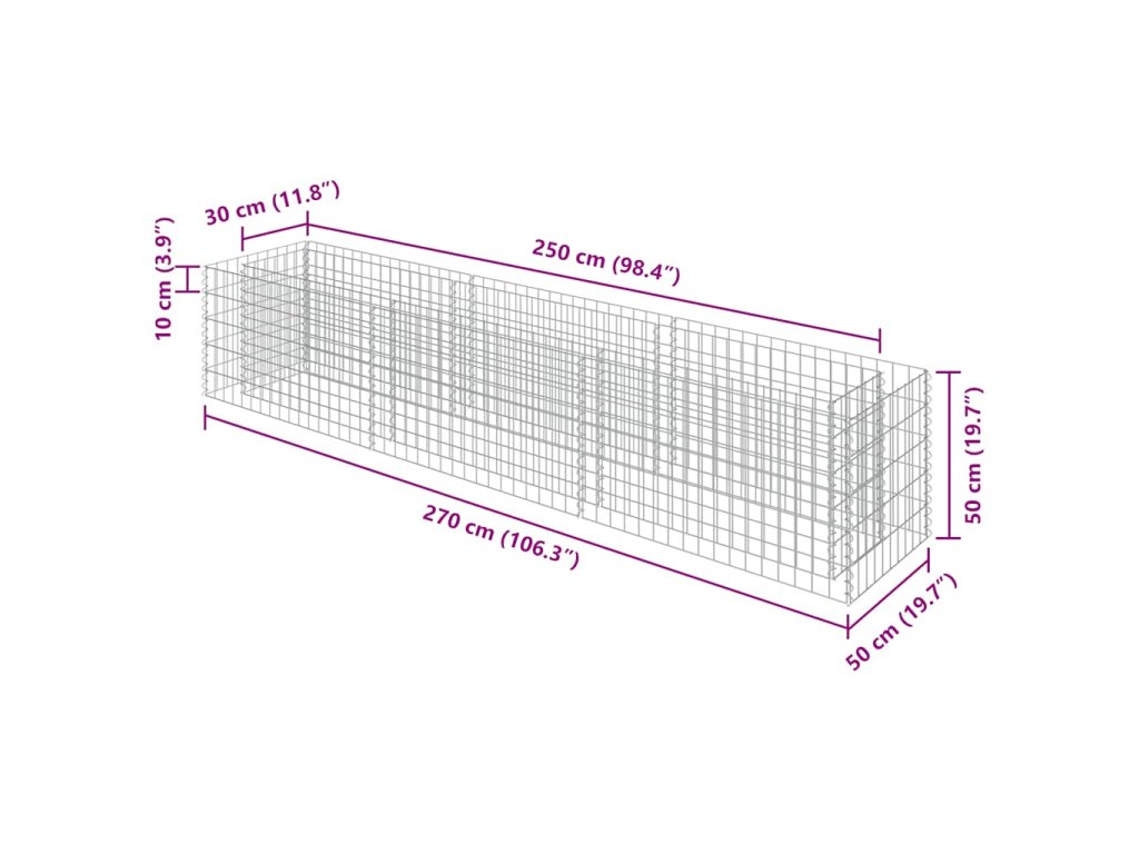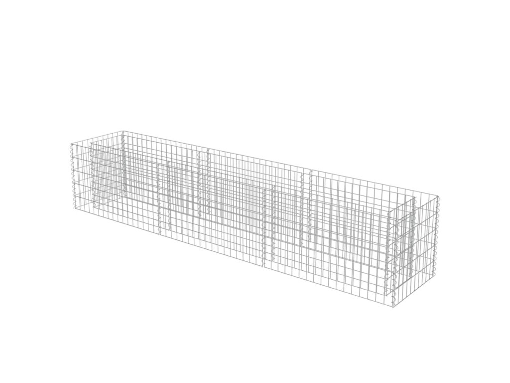 Robustní gabion je určen k tomu, aby byl naplněn kameny nebo štěrkem. Je vyrobený z nerezavějící pozinkované oceli, která nepodléhá povětrnostním vlivům, takže vysoký záhon je velmi stabilní a odolný. Síťová mřížka je tvořená svislými a vodorovnými dráty, které jsou ve všech spojích svařené, aby se tak zajistila mimořádná pevnost.