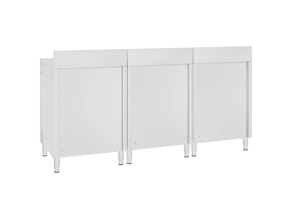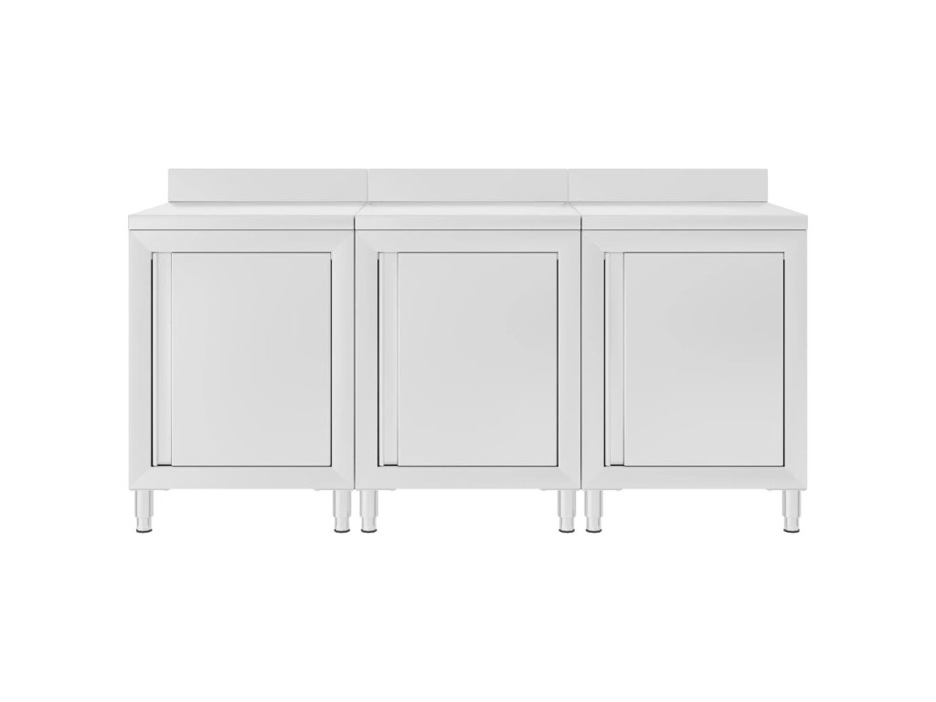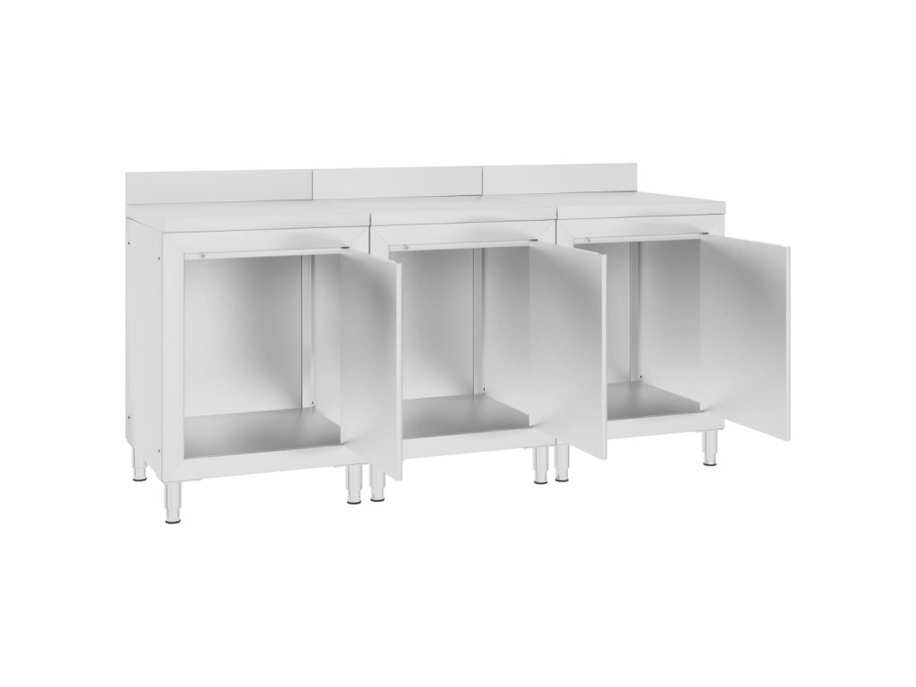 Set gastro skříněk je vyrobený z kvalitní nerezové oceli a je robustní, antikorozní a snadno se čistí. Spodní skříňka poskytuje dostatek úložného prostoru pro úklidové vybavení a příslušenství. Nastavitelné nožičky umožňují vyrovnat skříňku i na vodorovné ploše. Součástí skříňky je 10 cm vysoký zadní lem.