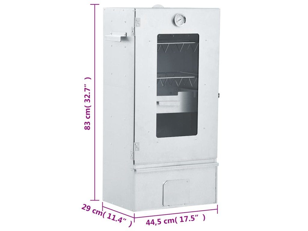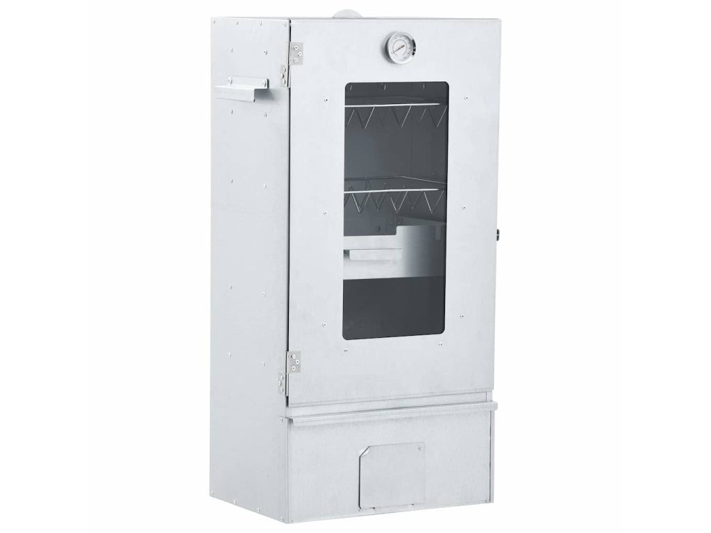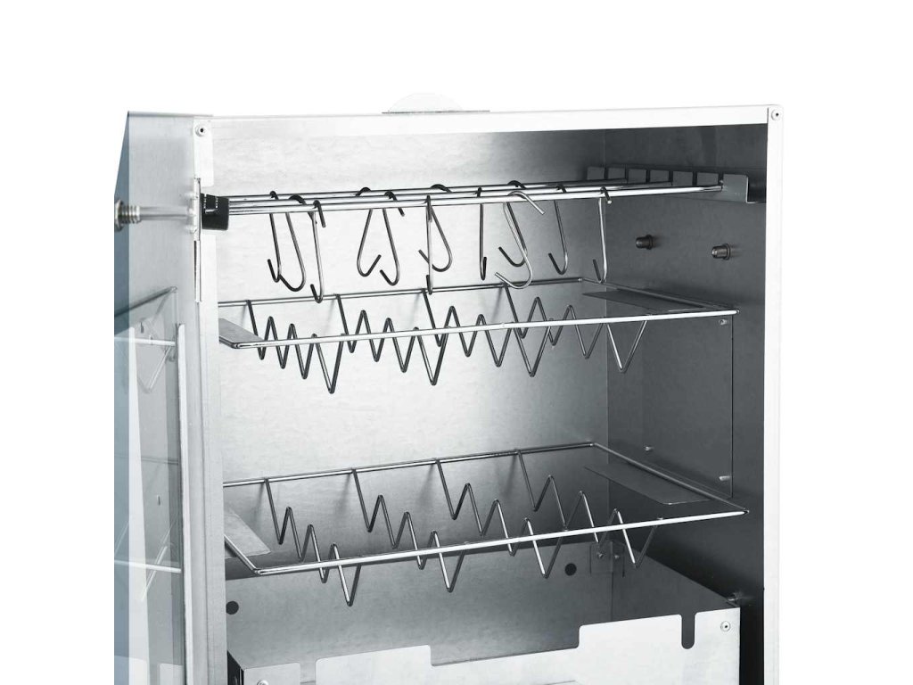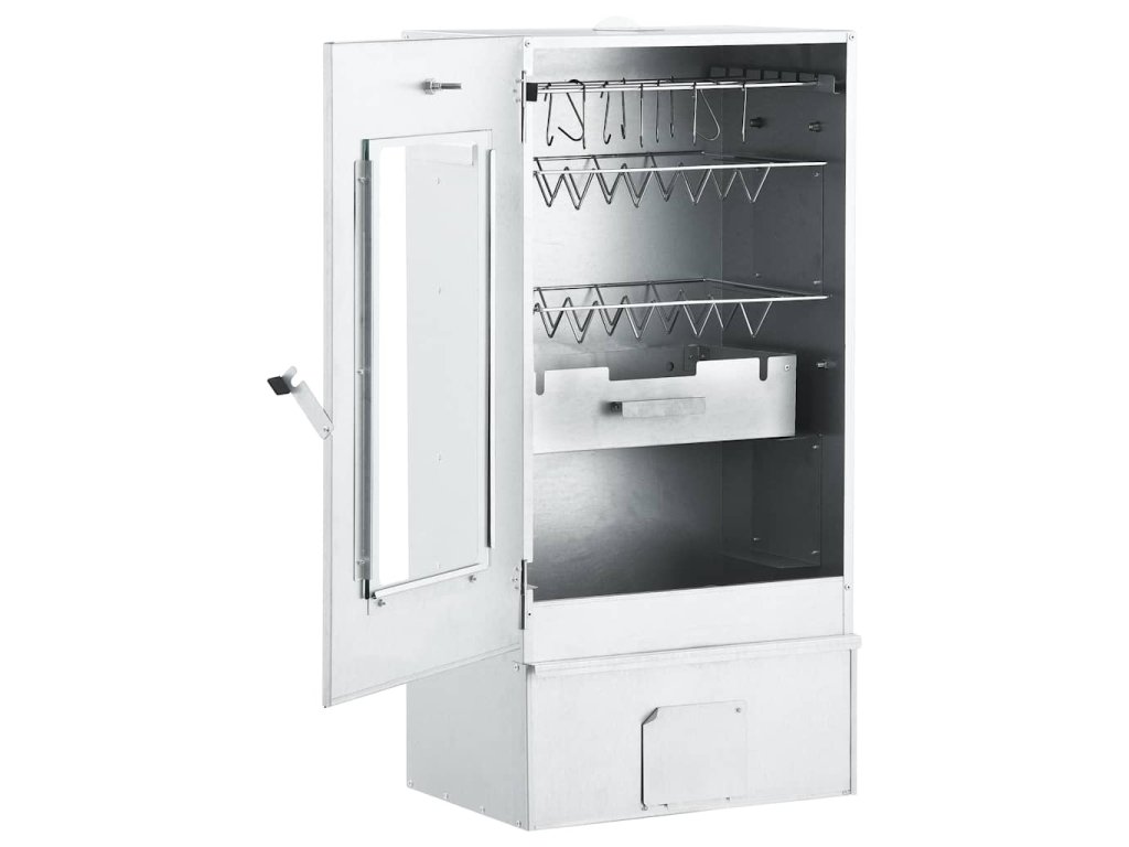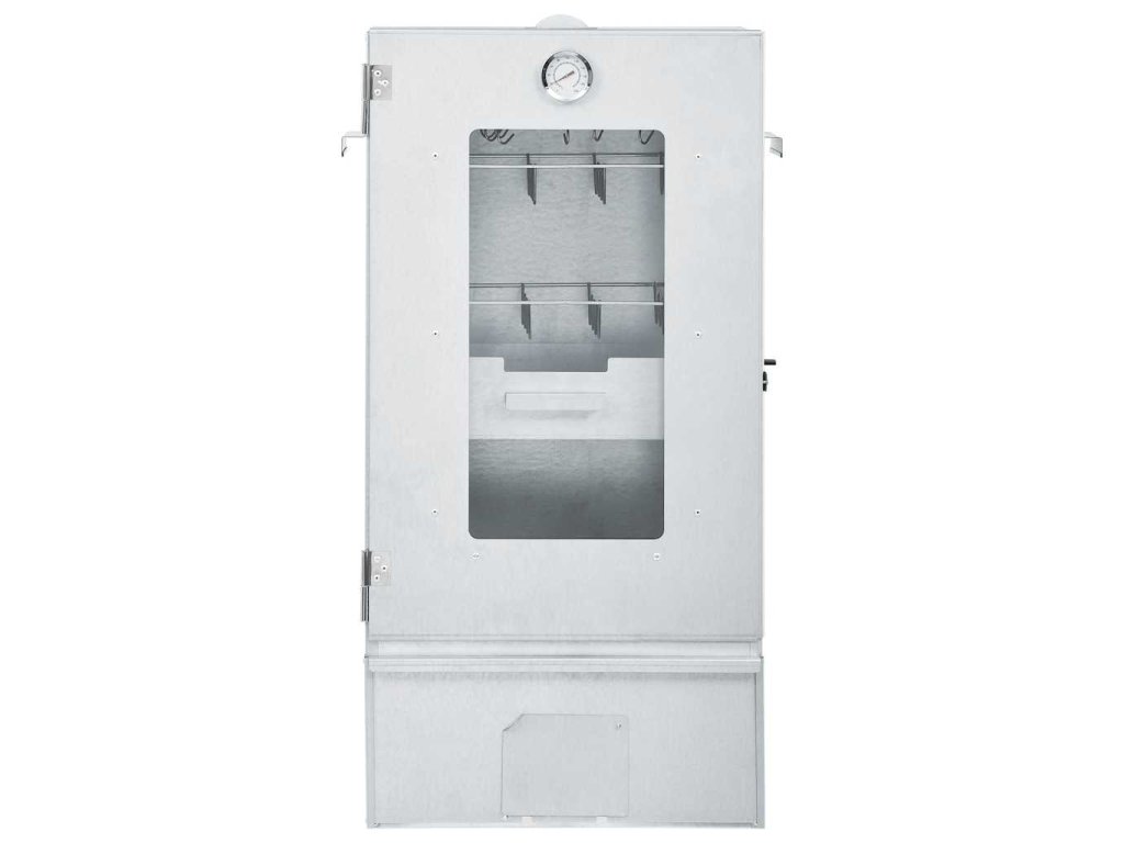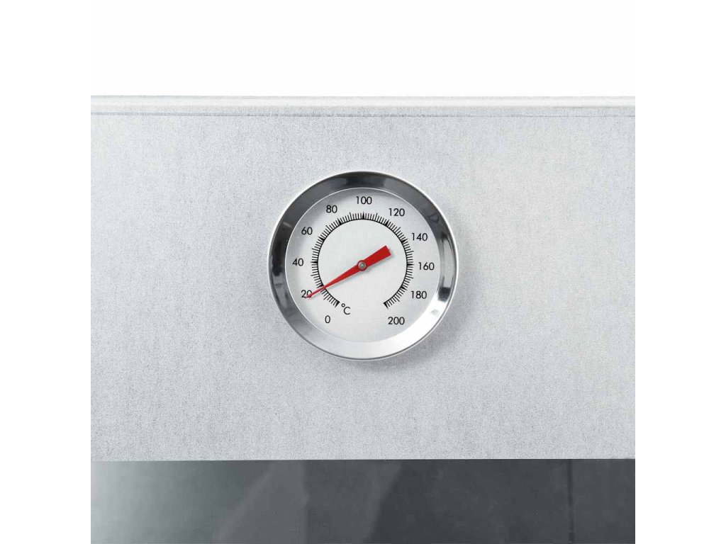 Udírna je vybavená teploměrem, abyste měli neustále přehled o teplotě uvnitř komory. Okénkem můžete rovněž kontrolovat připravované jídlo. Udící trouba měří na výšku 83 cm, takže máte spoustu místa na uzení masa.
