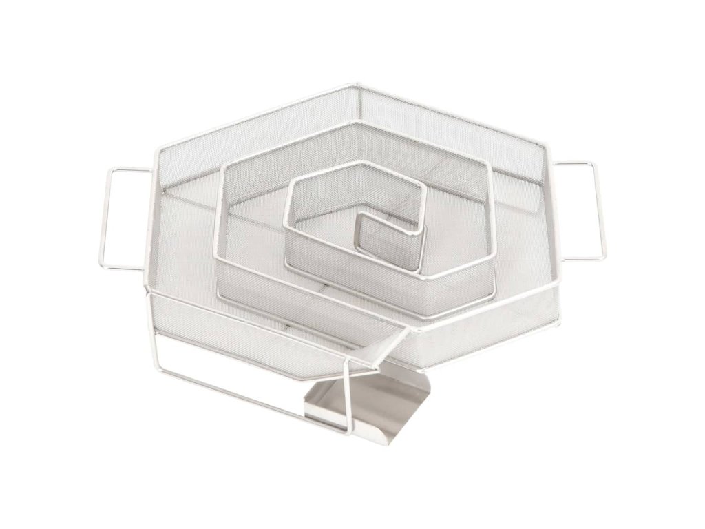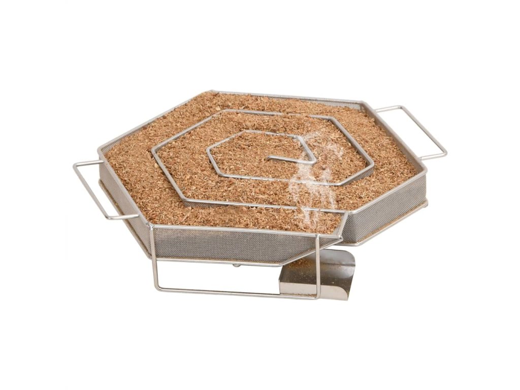 - Generátor studeného kouře: Stačí naplnit pilinami a zapálit čajovou svíčkou, dokud piliny nezačnou měnit barvu. Vyjměte čajovou svíčku a umístěte generátor kouře do udírny. Kompaktní šestihranná mřížka umožňuje rovnoměrné a pomalé hoření štěpků po dobu až 8 hodin.